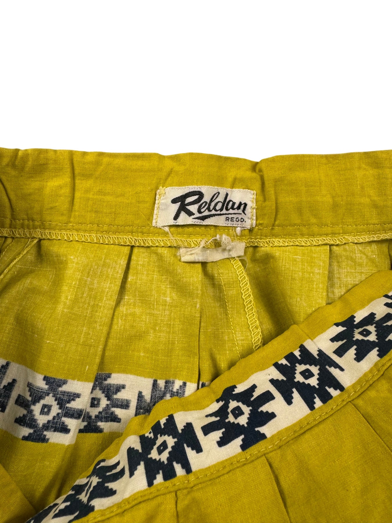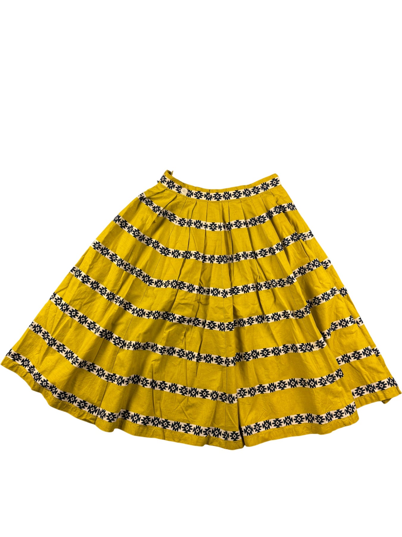 Yellow pleated skirt with black geometric pattern. Made by Reldan. Features a gathered waistline and wide hem.