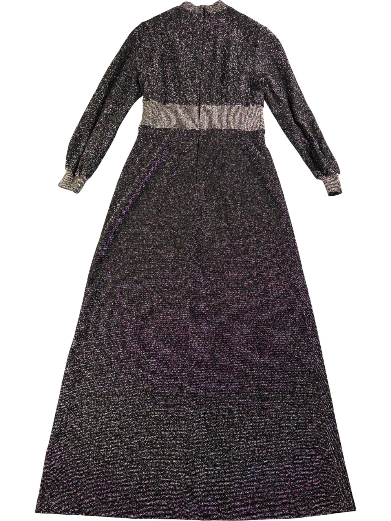 Shimmering metallic fabric with long sleeves. Fitted around the waist with stretchy cuffs and collar. Full-length maxi design.