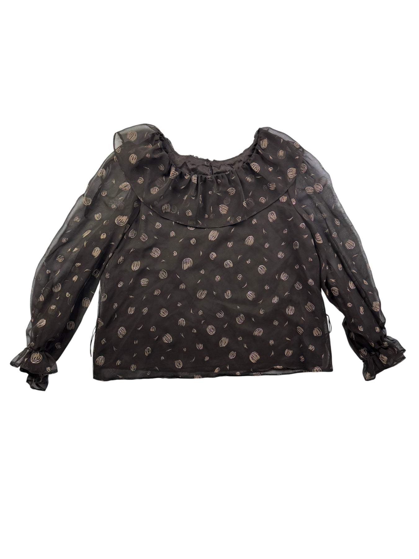 Sheer black blouse with polka dot pattern. Made from 100% polyester with a lining of 100% acetate. Features a ruffled collar and cuffed sleeves.