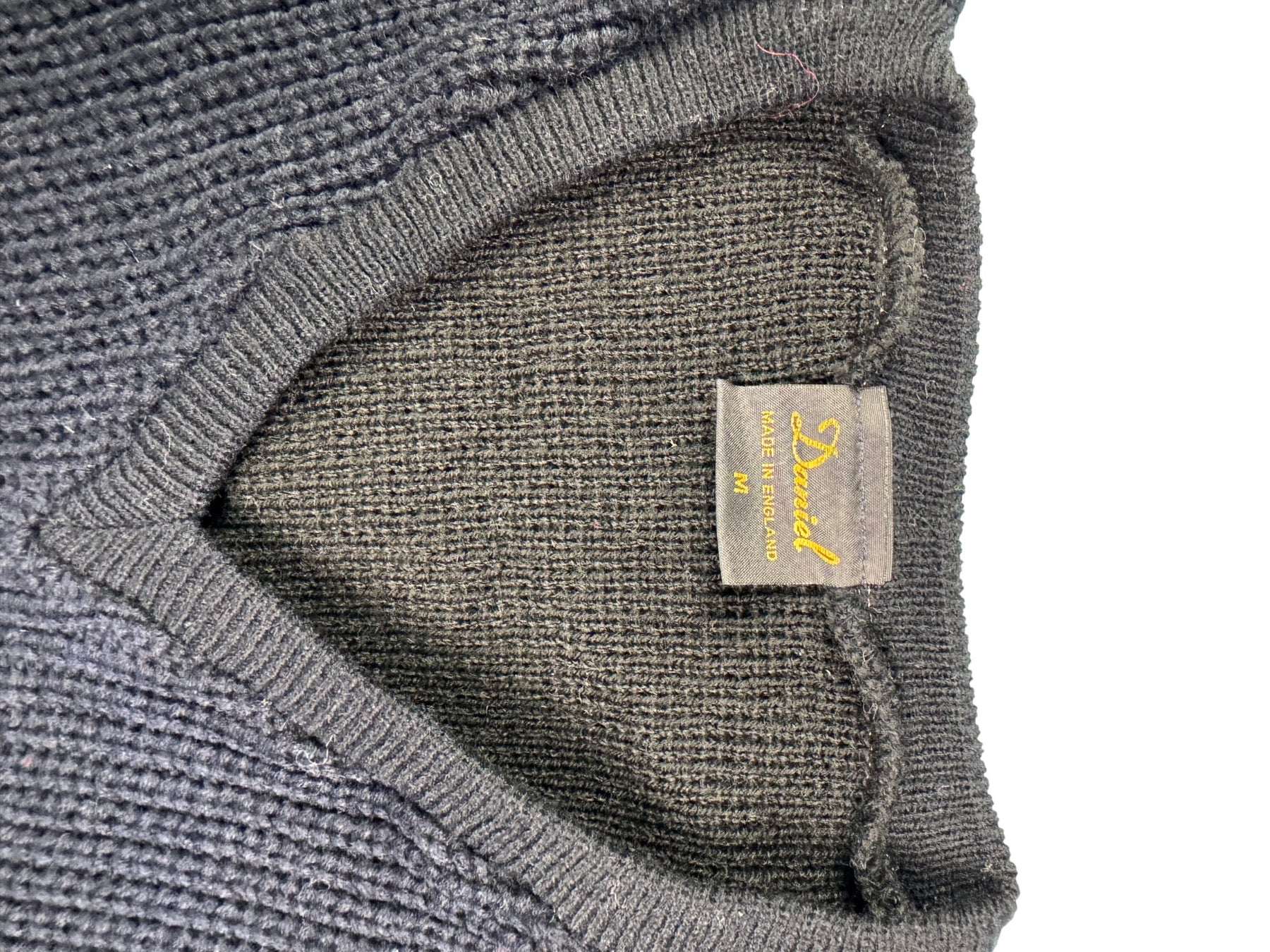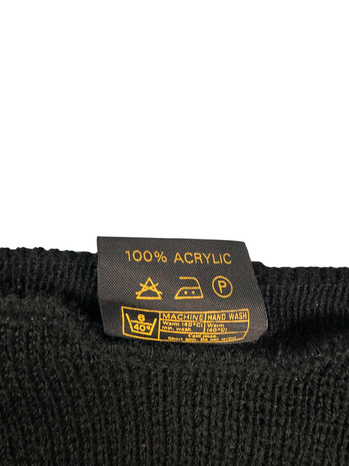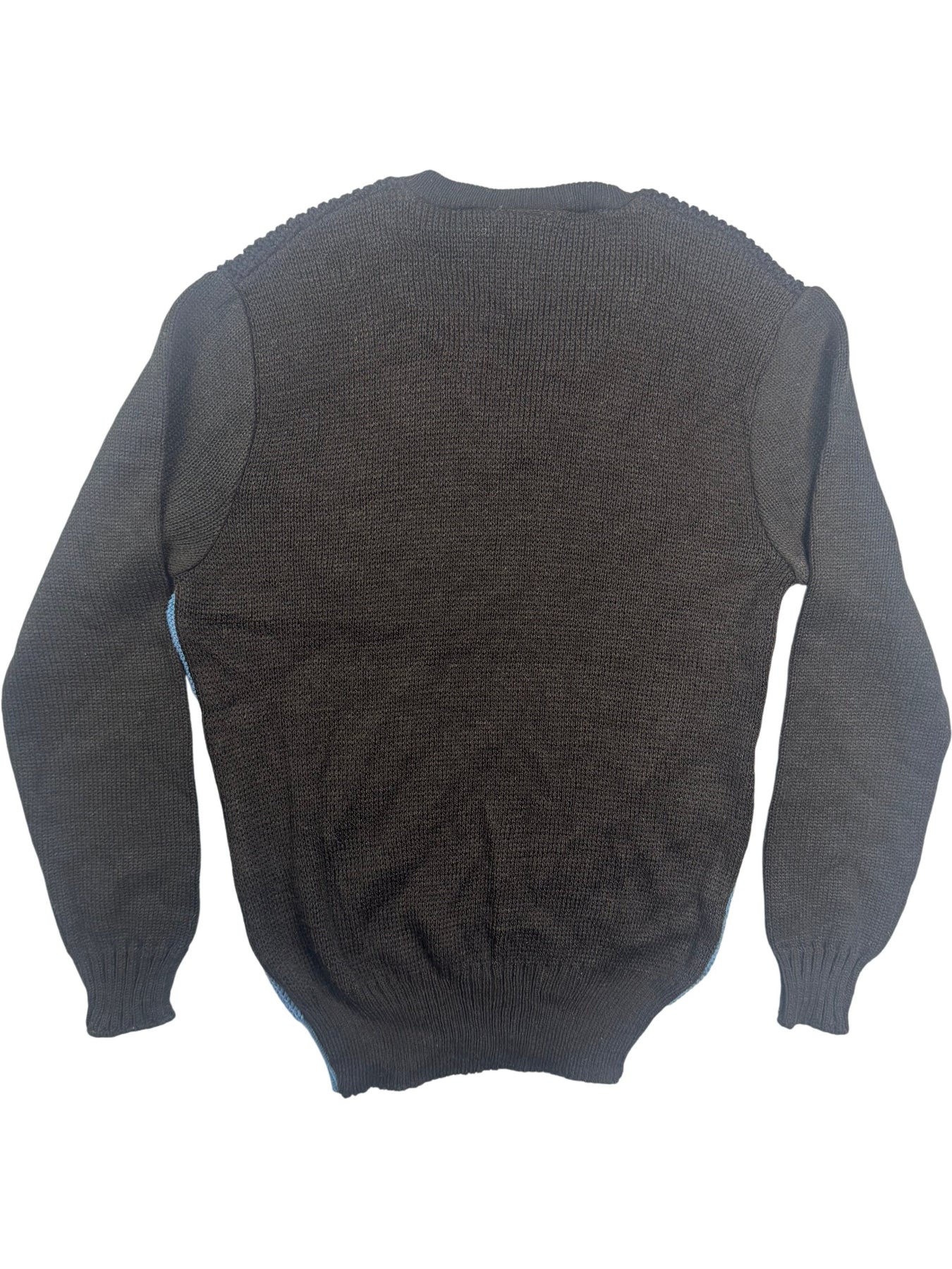 V-neck sweater with a distinctive colour block design in black and blue. Made from 100% acrylic for a comfortable fit. Features ribbed cuffs and hem. Made in England.