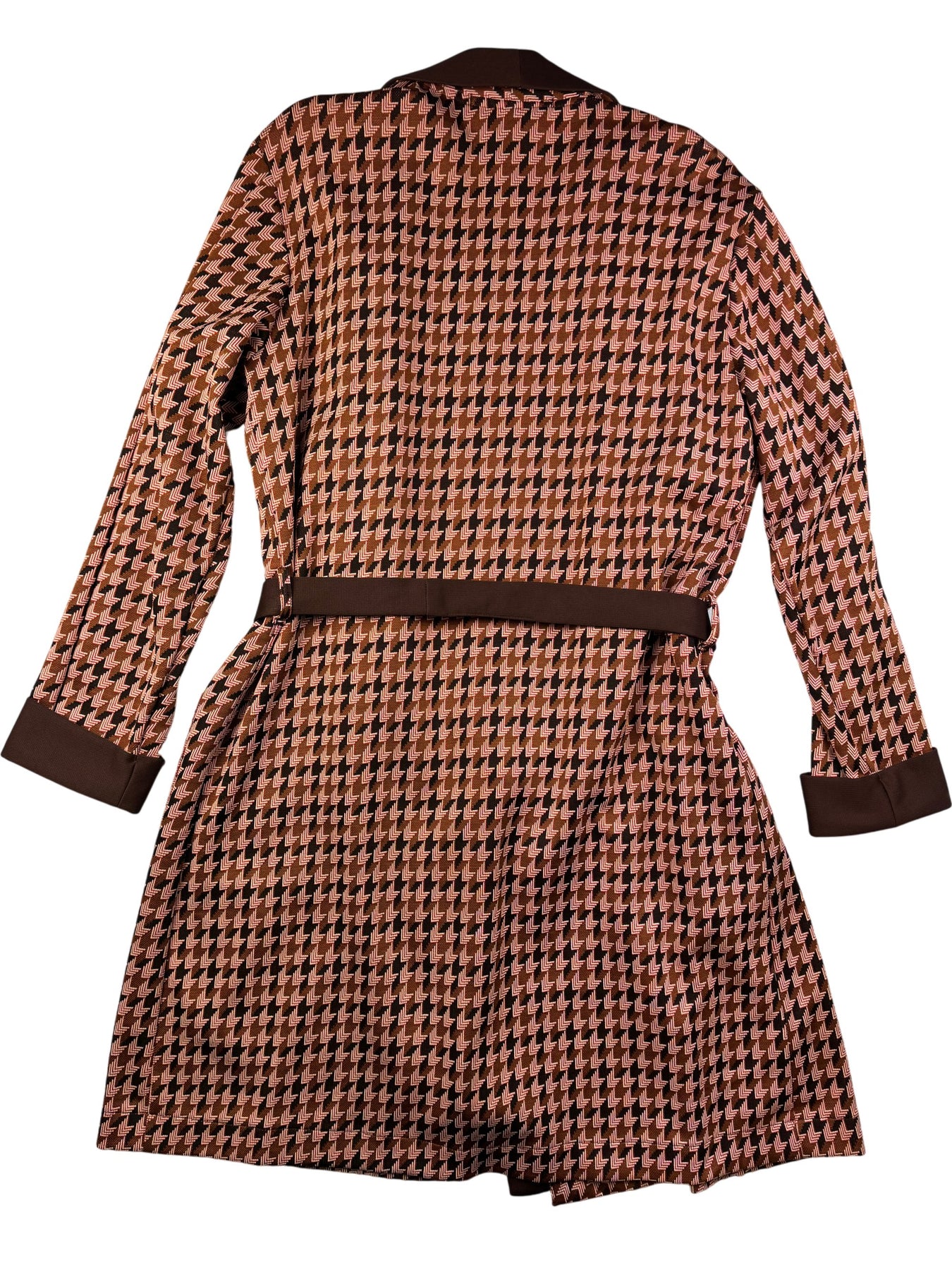 This brown nightgown features a classic houndstooth pattern with a contrasting solid trim. It includes a matching belt and is made of 100% triacetate. Made in the UK by St Michael.
