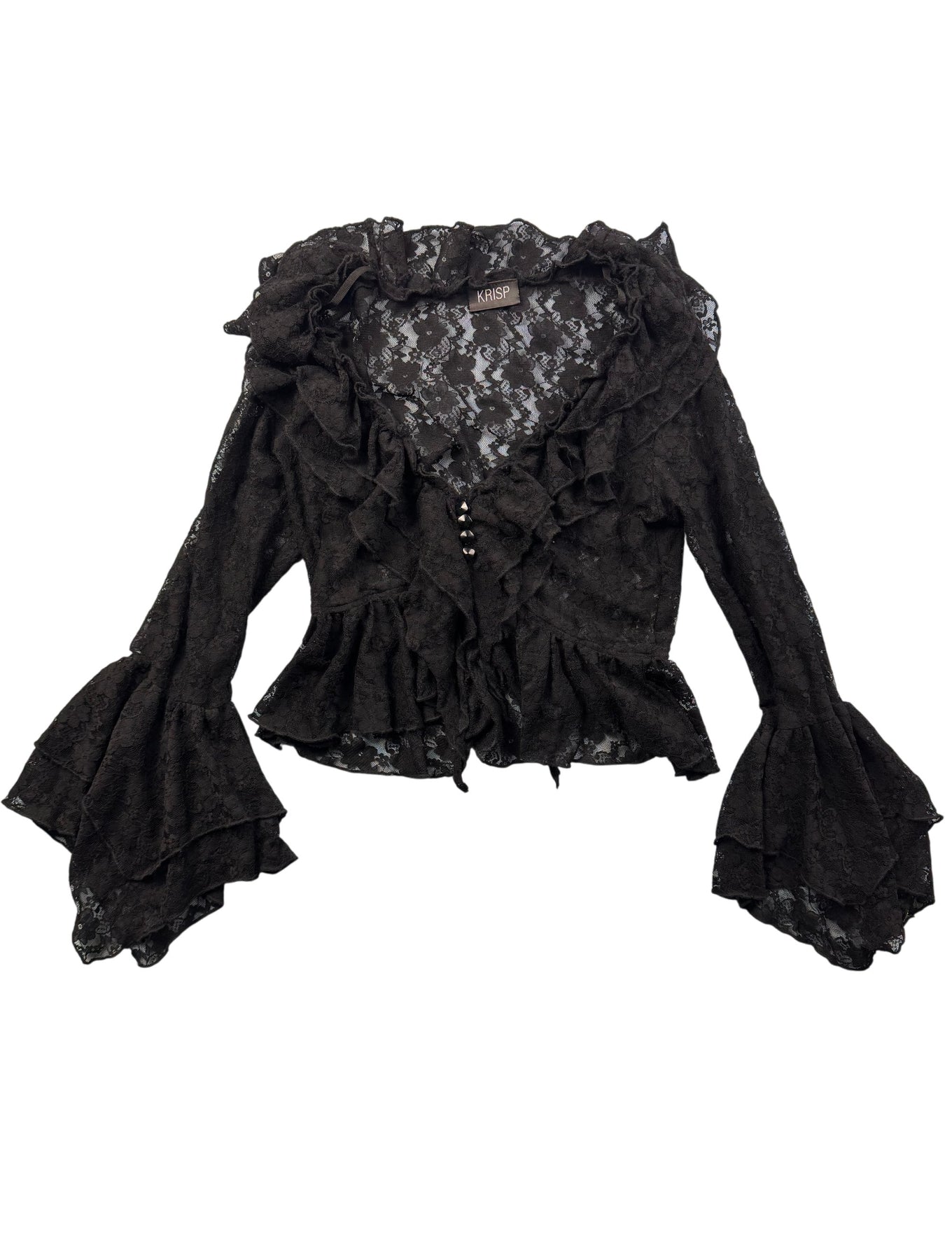 Black lace blouse with ruffle details on the neckline and sleeves. Made from 87% nylon and 13% elastane, offering stretch for comfort. Features a button-down front and flared sleeves.