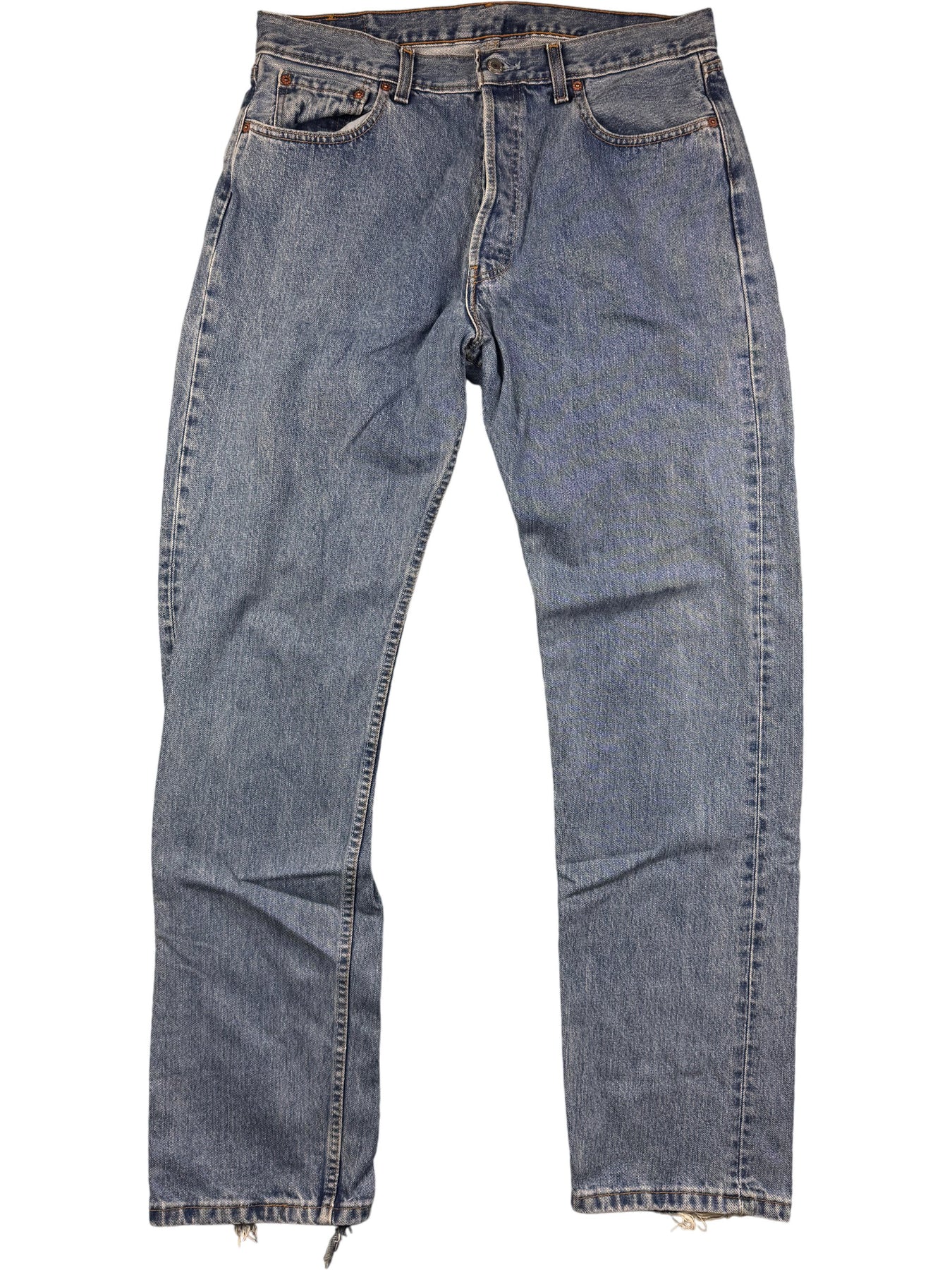 Classic Levi jeans with a straight leg design and a stone wash finish. Features include a traditional five-pocket style, button fly, and signature Levi's branding at the back.