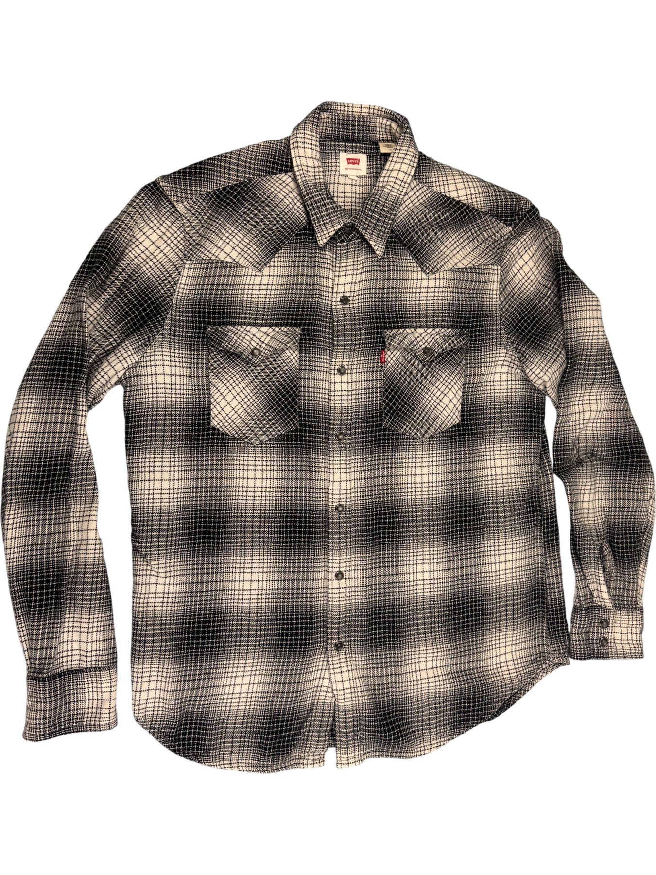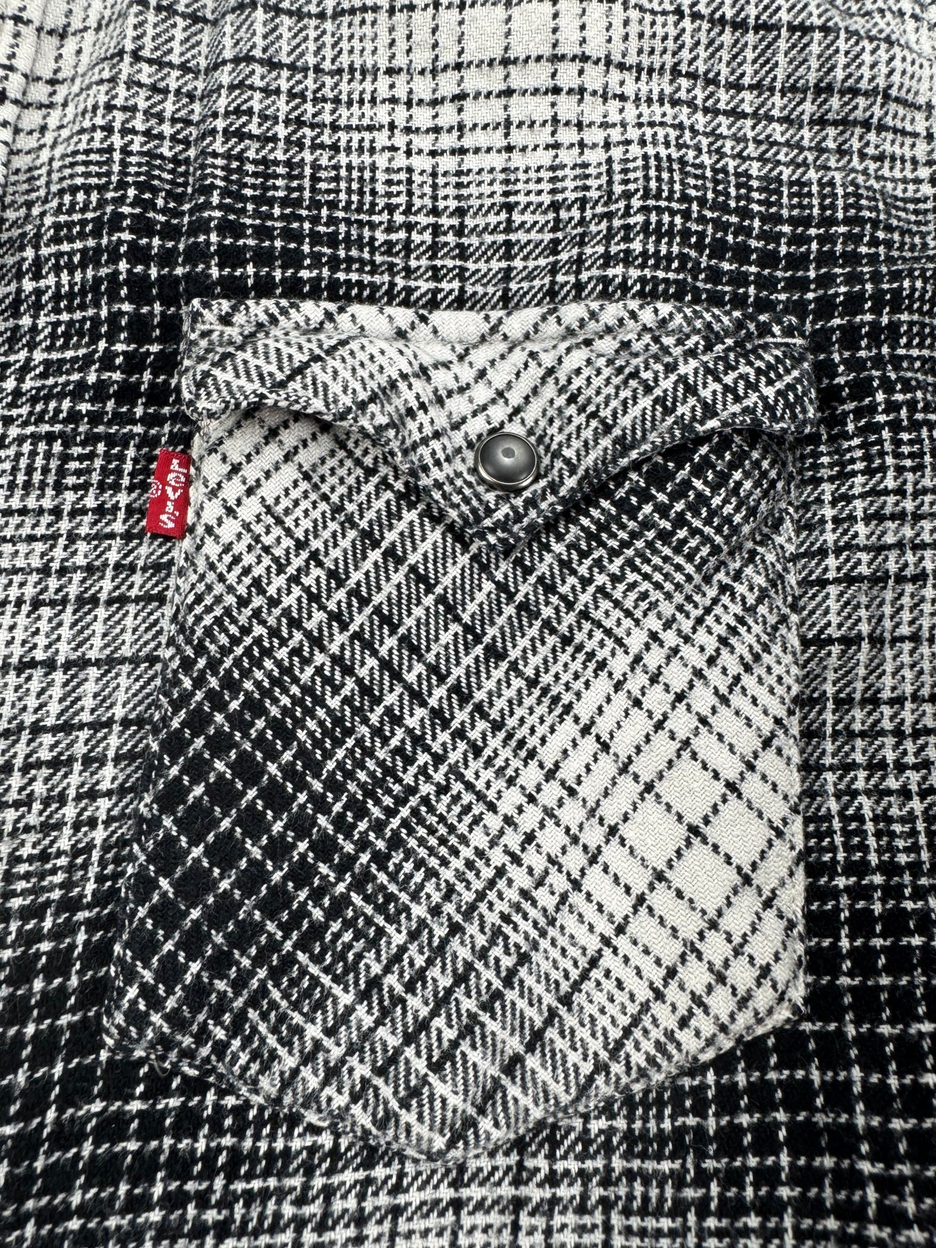 Levi's long sleeve shirt with a classic black and white plaid pattern. Features two front pockets with button flaps. Made from a comfortable fabric.