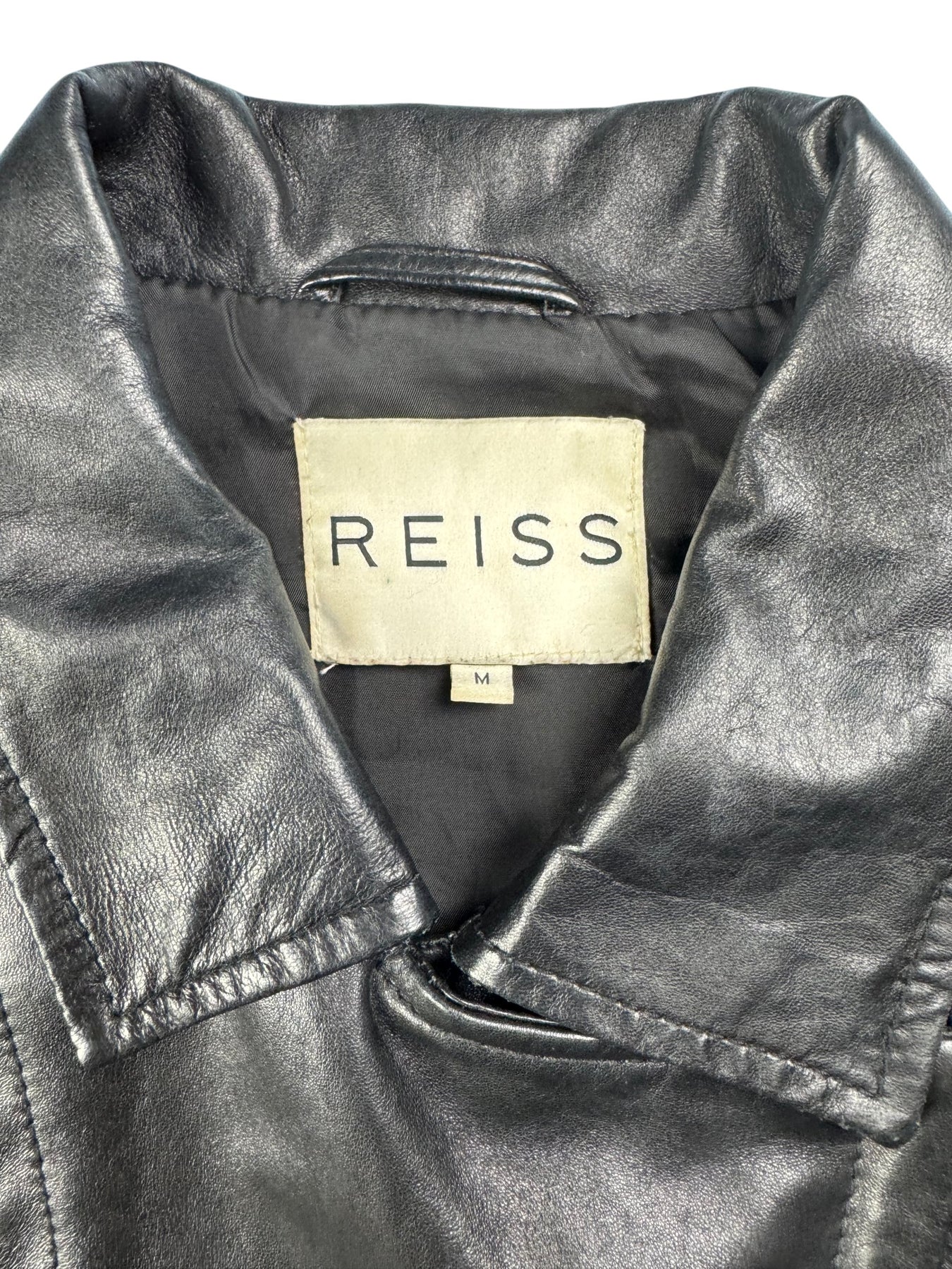 Genuine leather bomber jacket with front zip closure and two zippered pockets. Made from 100% lamb leather with a polyester lining. Features a tailored fit and classic collar.