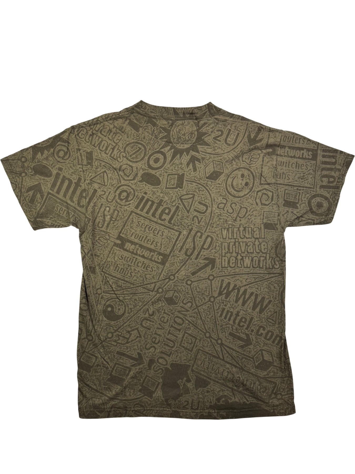 100% cotton Tultex T-shirt with a graphic design featuring various technology-related symbols and texts. Preshrunk and assembled in Jamaica from U.S. parts. Large size.