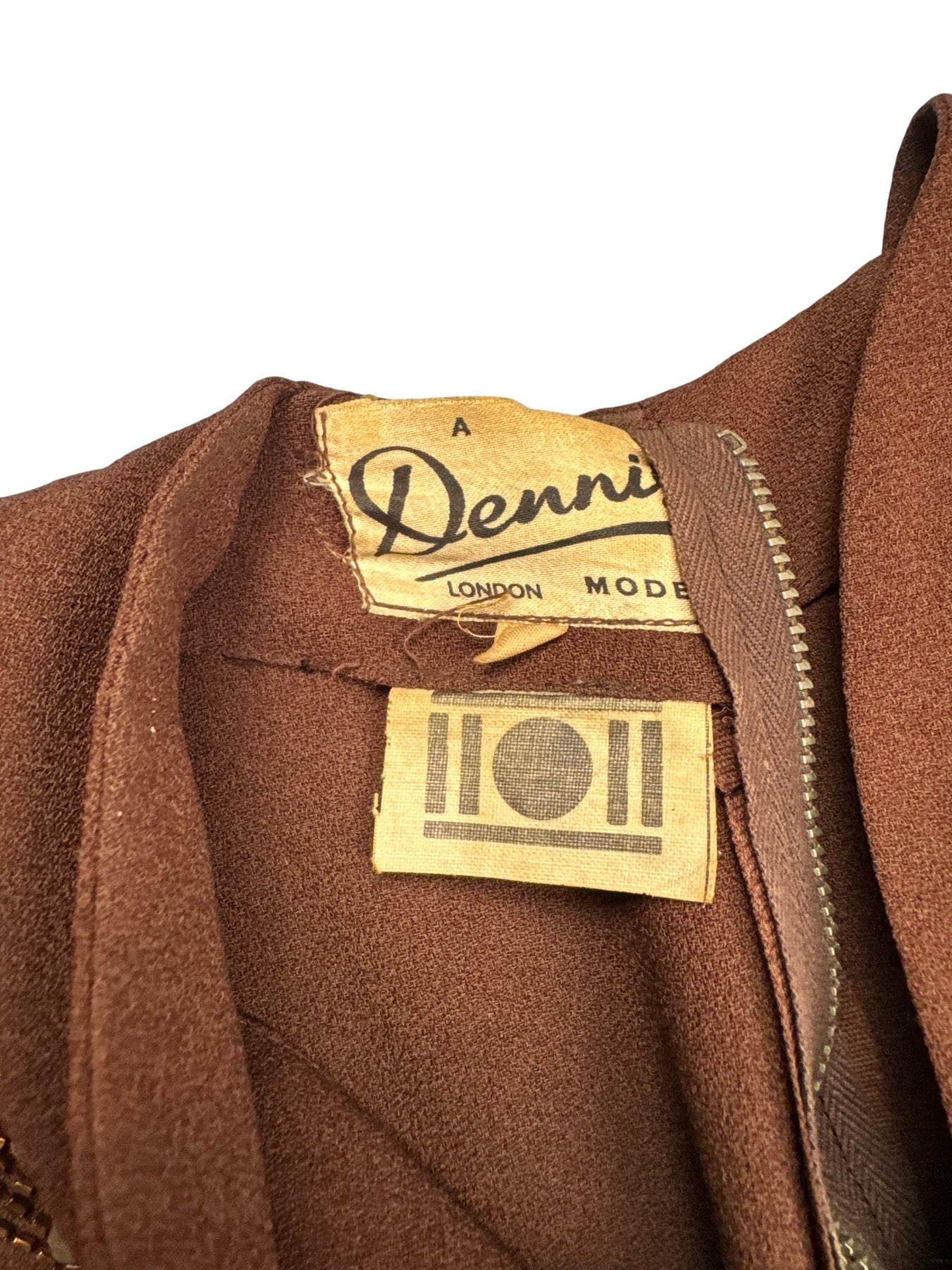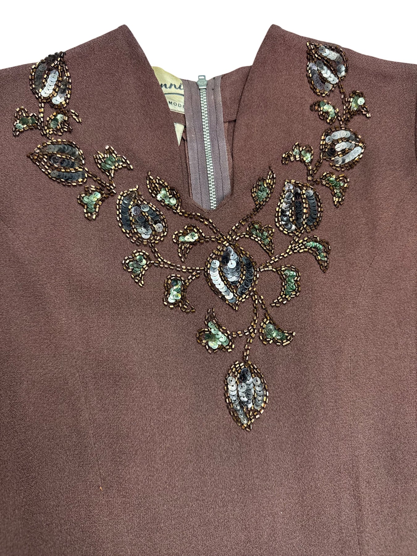 This dress features an elegant brown hue with intricate bead and sequin embellishments around the neckline. It has a belted waist and a layered skirt with three-quarter sleeves.