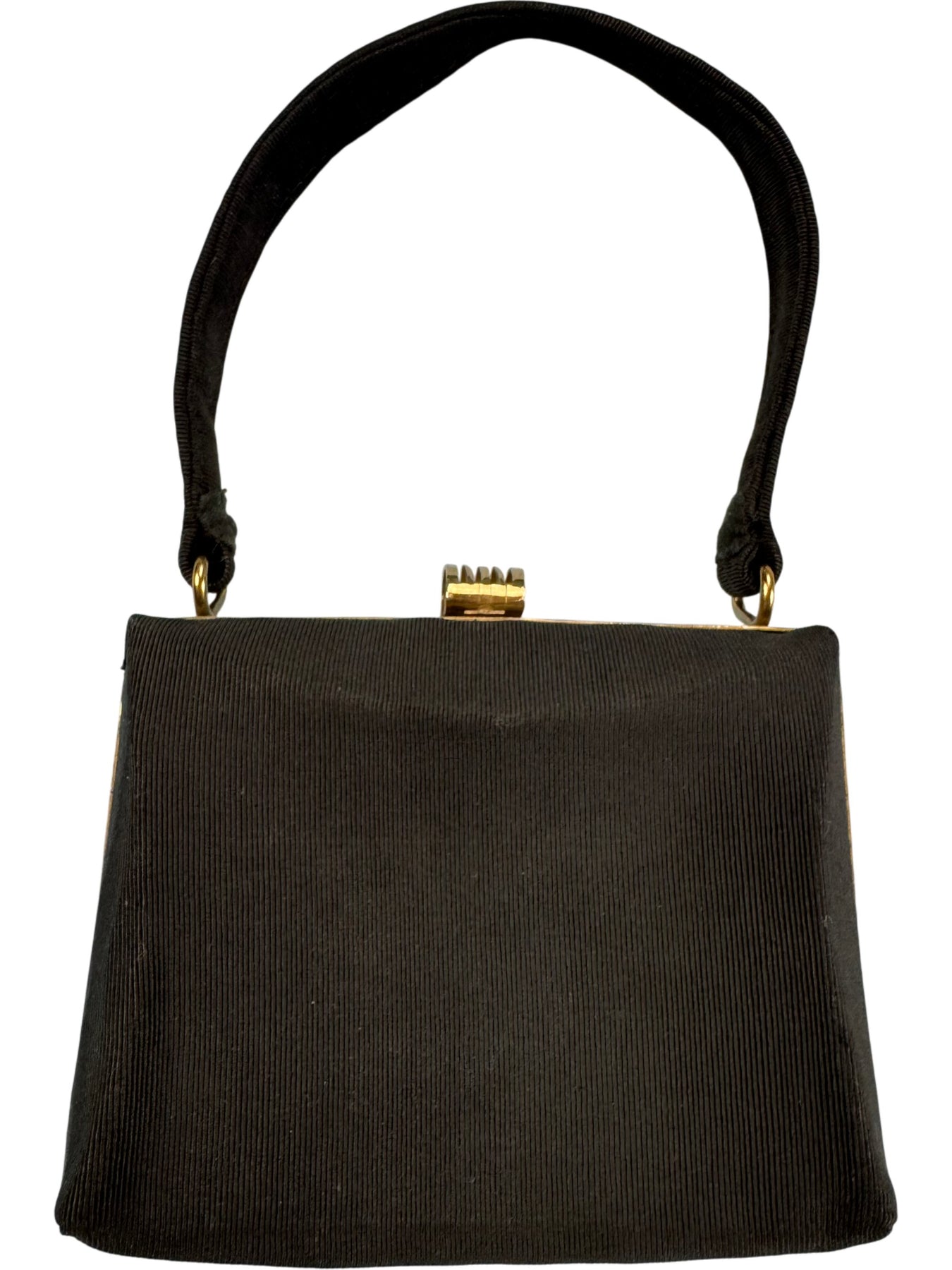 Classic black handbag featuring a gold metal frame and an elegant clasp closure. Designed with a textured fabric exterior and a soft interior lining. Includes a sturdy handle, ideal for evening wear.