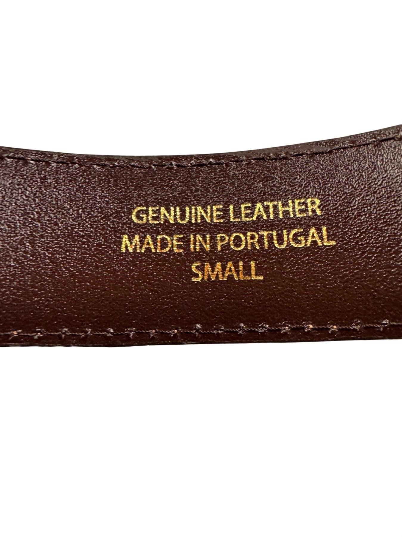 Genuine leather belt with a distinct patterned design. Features a gold-tone buckle and is crafted in Portugal. Available in size small.