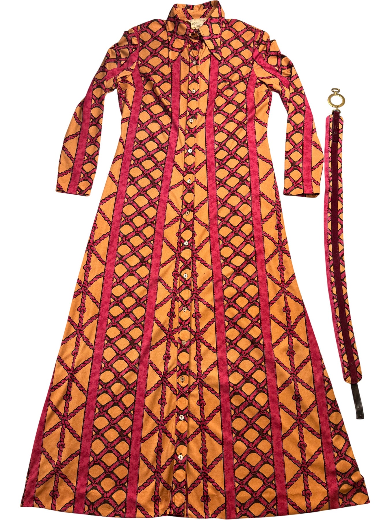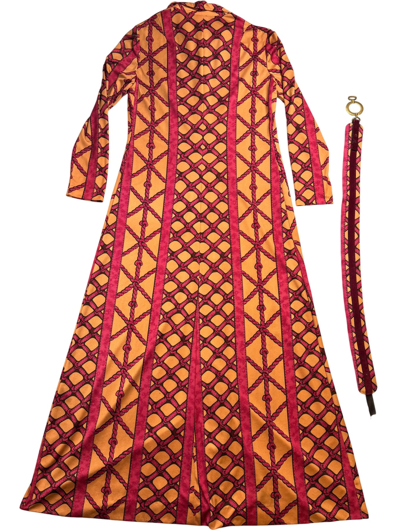 1970s maxi dress with a geometric pattern, featuring a button-up front and long sleeves. Includes a matching belt for added style.