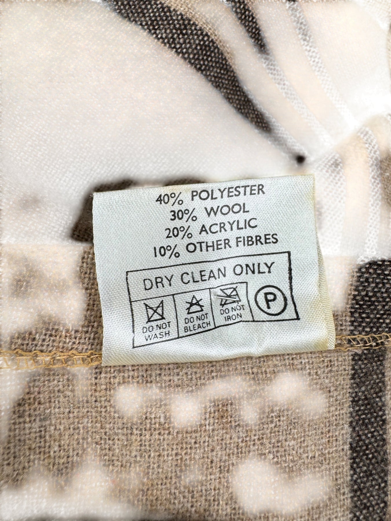 Beige robe with brown stripes featuring a belt. Made of 40% polyester, 30% wool, 20% acrylic, and 10% other fibres. Dry clean only.