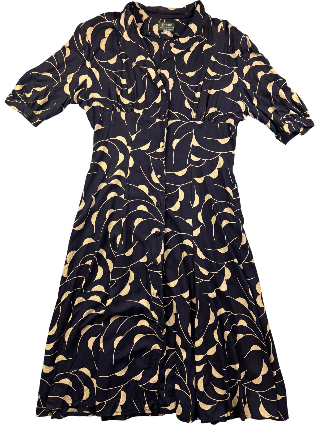This dress features a distinctive abstract pattern with a button-up front. Made in England by Hobbs, it showcases a design flair by Marilyn Anselm.