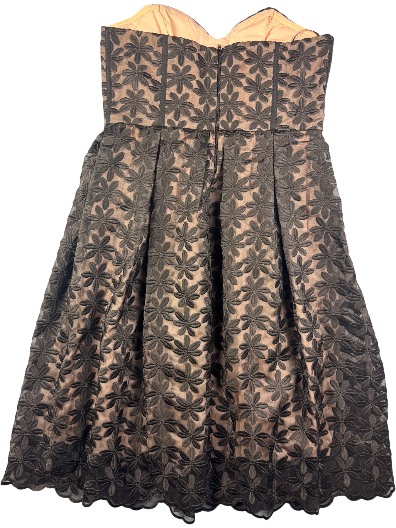 Strapless dress with floral embroidery. Made from 100% polyester, lining is 64% polyester and 36% cotton. Features a zip closure at the back.