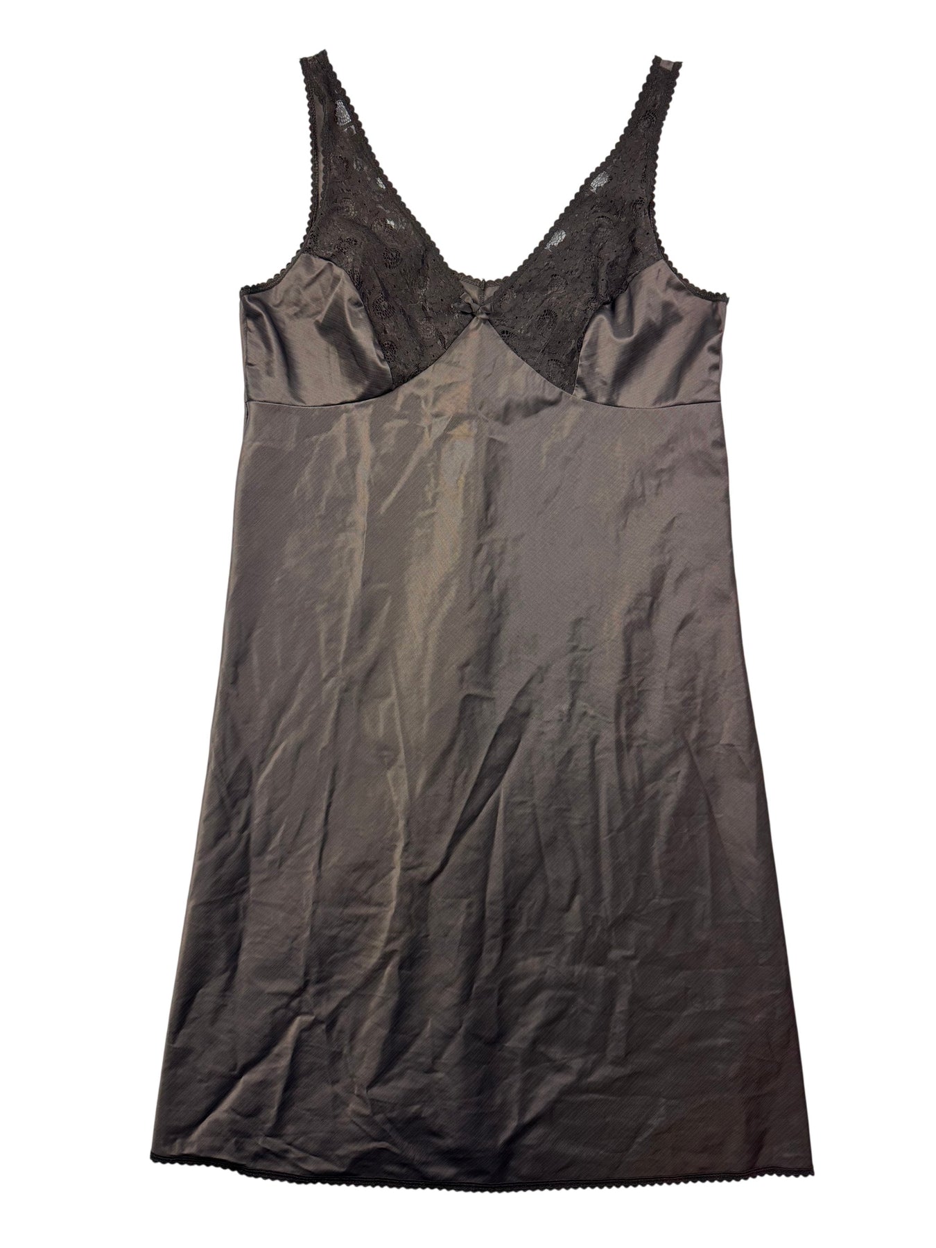 Black slip dress made from 100% nylon. Features lace detailing at the bust and straps, with a smooth satin-like finish. Made in the UK.