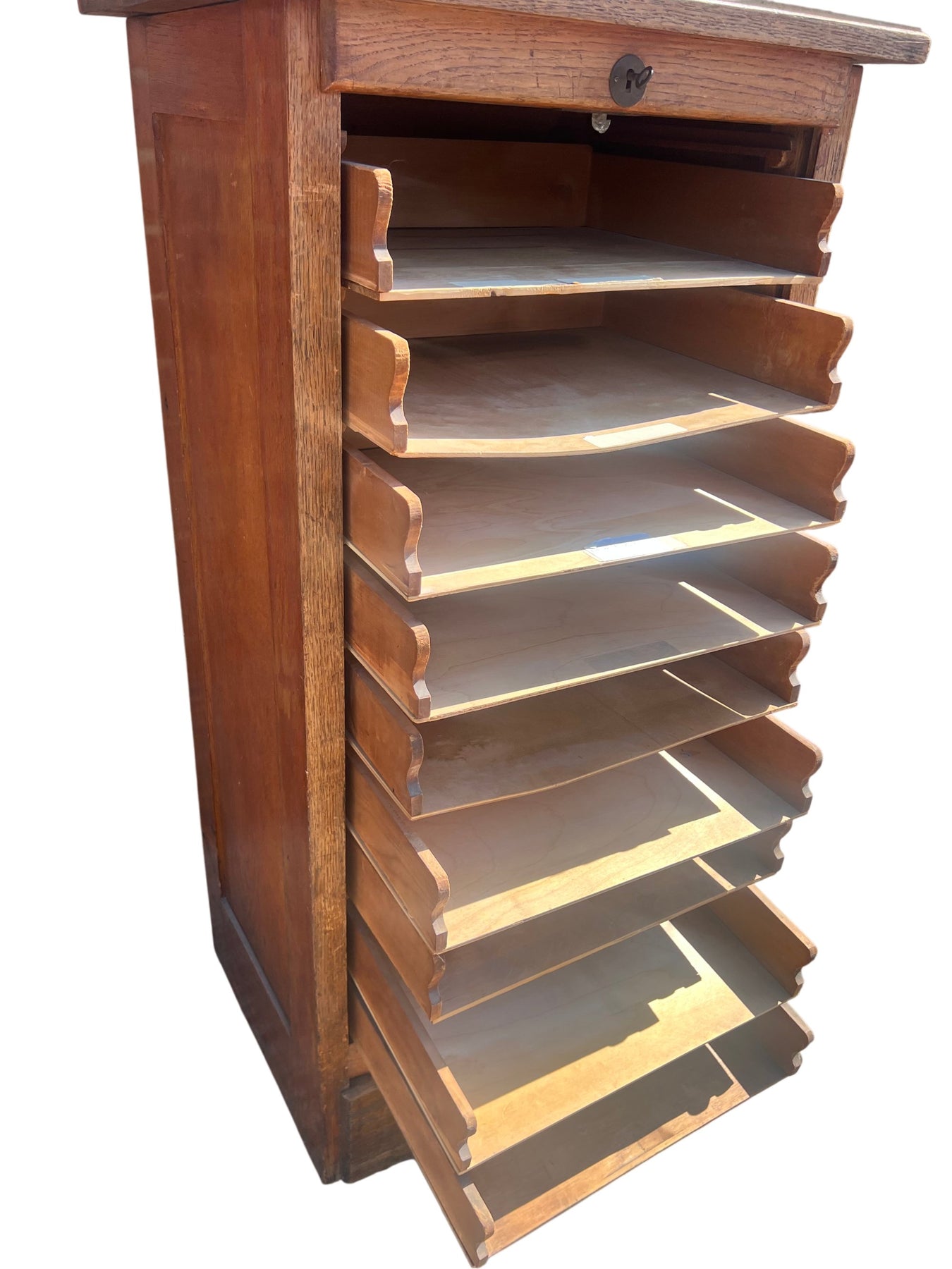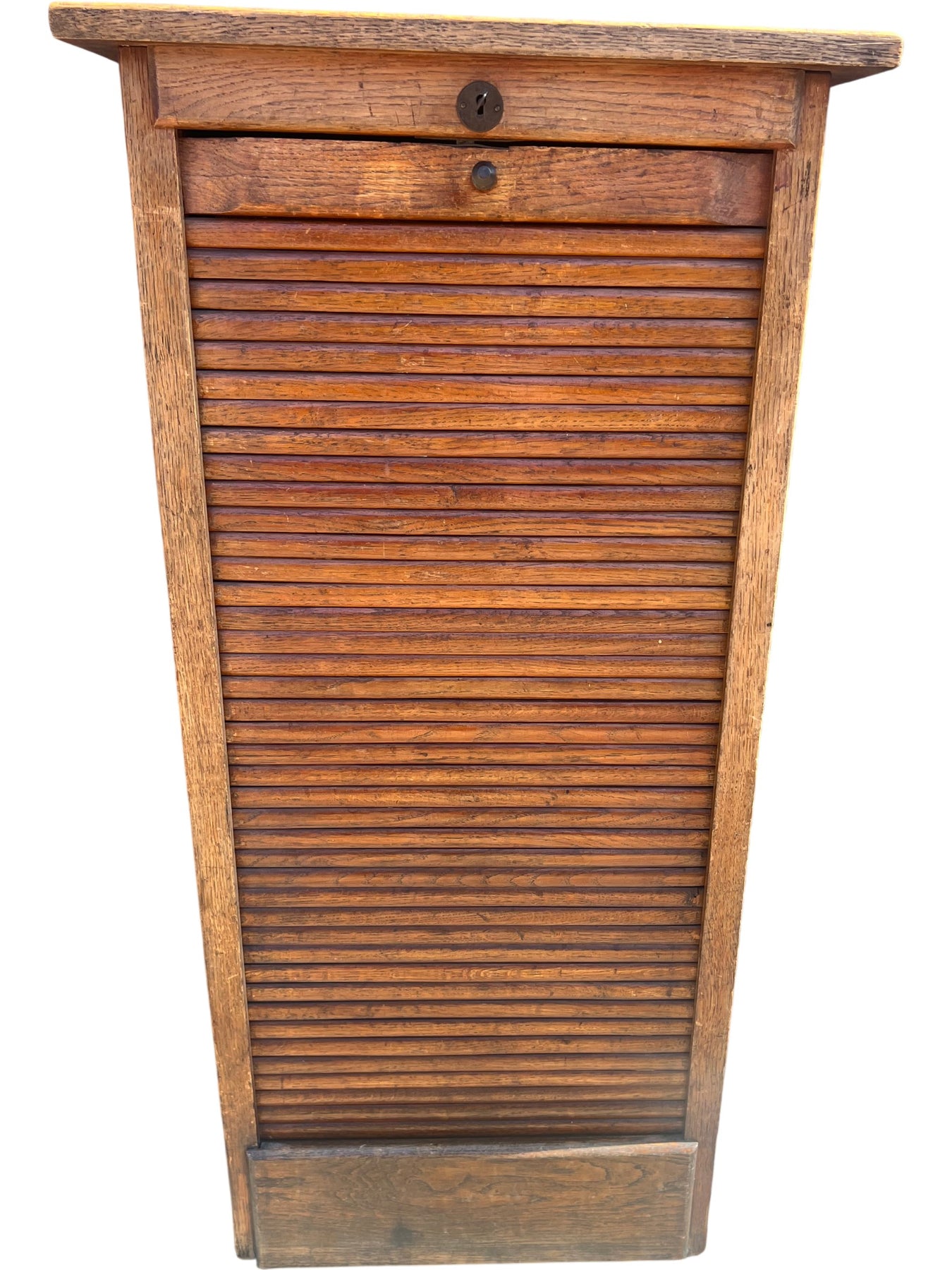 This is an antique tambour front cabinet made of oak wood. The cabinet features a roll-top door and several interior shelves for storage. The piece is designed with a locking mechanism.