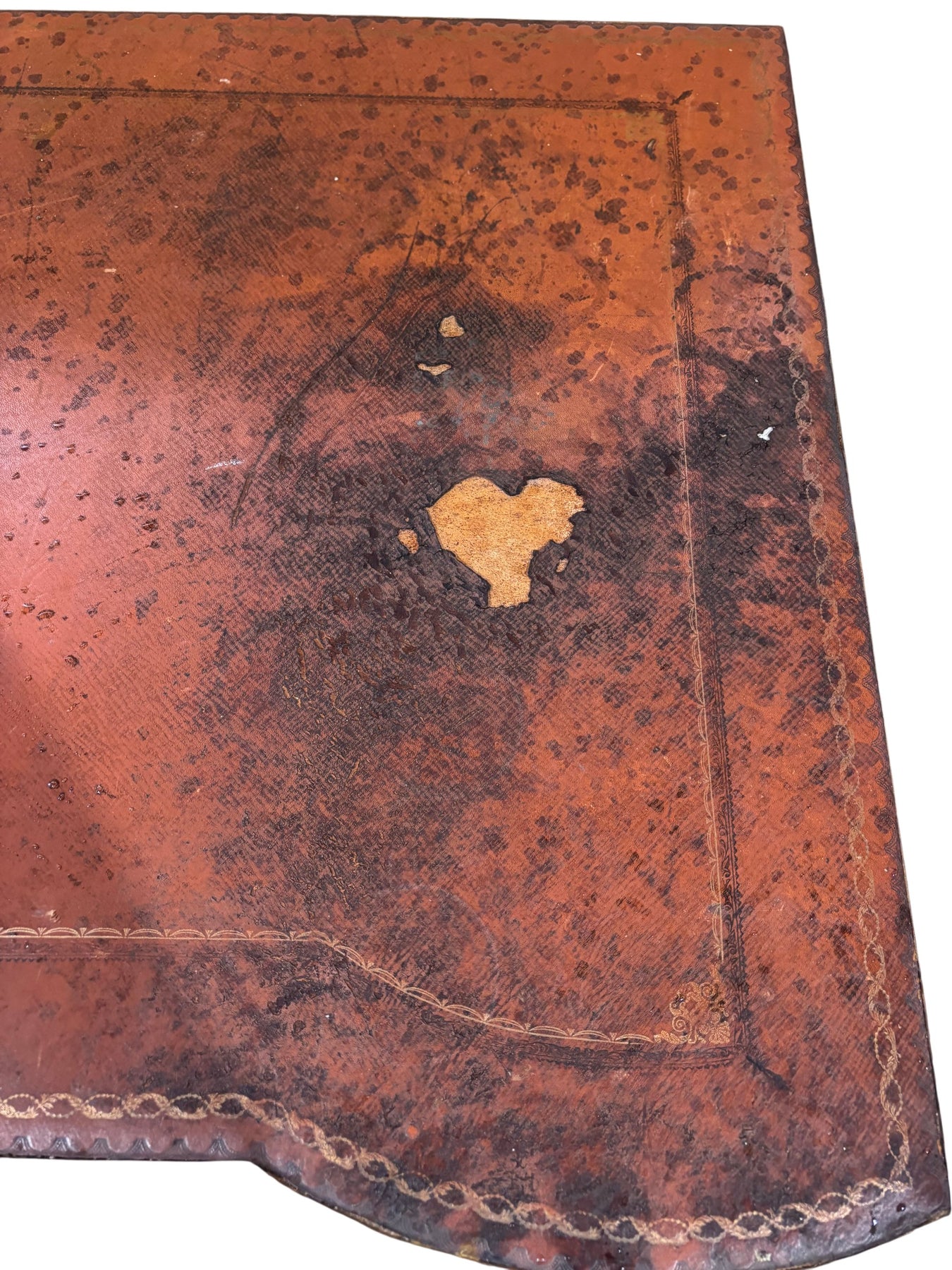 Elegant antique desk featuring a red leather inlay on the tabletop. Comes with six drawers for ample storage and a shelf for additional space. Intricately designed handles enhance its vintage appeal.