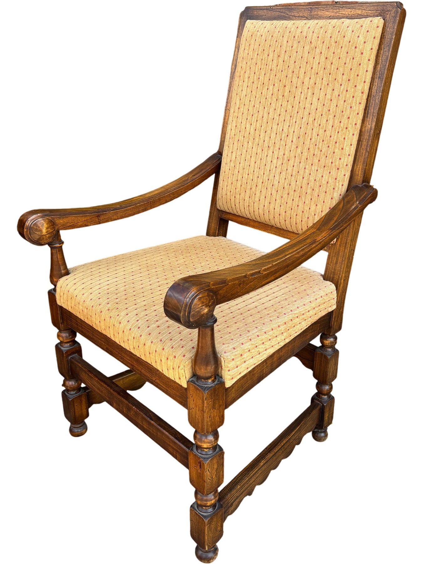 Dining set includes a rectangular wooden table with six matching chairs. The table features a detailed patterned surface and sturdy turned legs. Chairs have upholstered seats and high backs for comfort. Table measurements are as followed. Height:76cm Length:200cm width:110cm