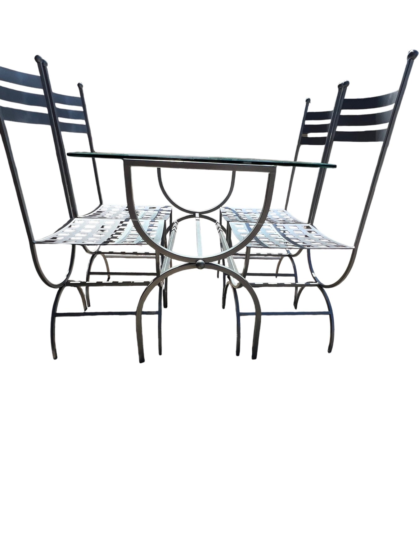 Contemporary dining table set with a glass tabletop and metal frame. Includes four matching metal chairs with slatted backrest design. Suitable for indoor or outdoor use.
