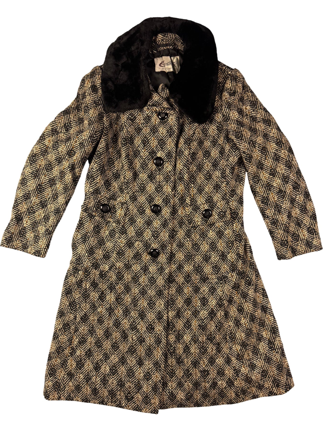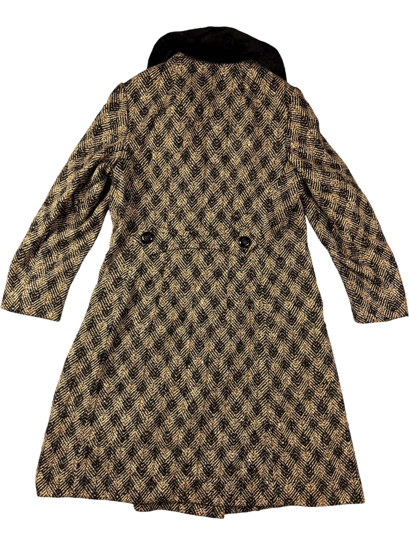 Herringbone patterned wool coat with faux fur collar. Double-breasted button closure and two front pockets. Features a belt loop detail at the back.