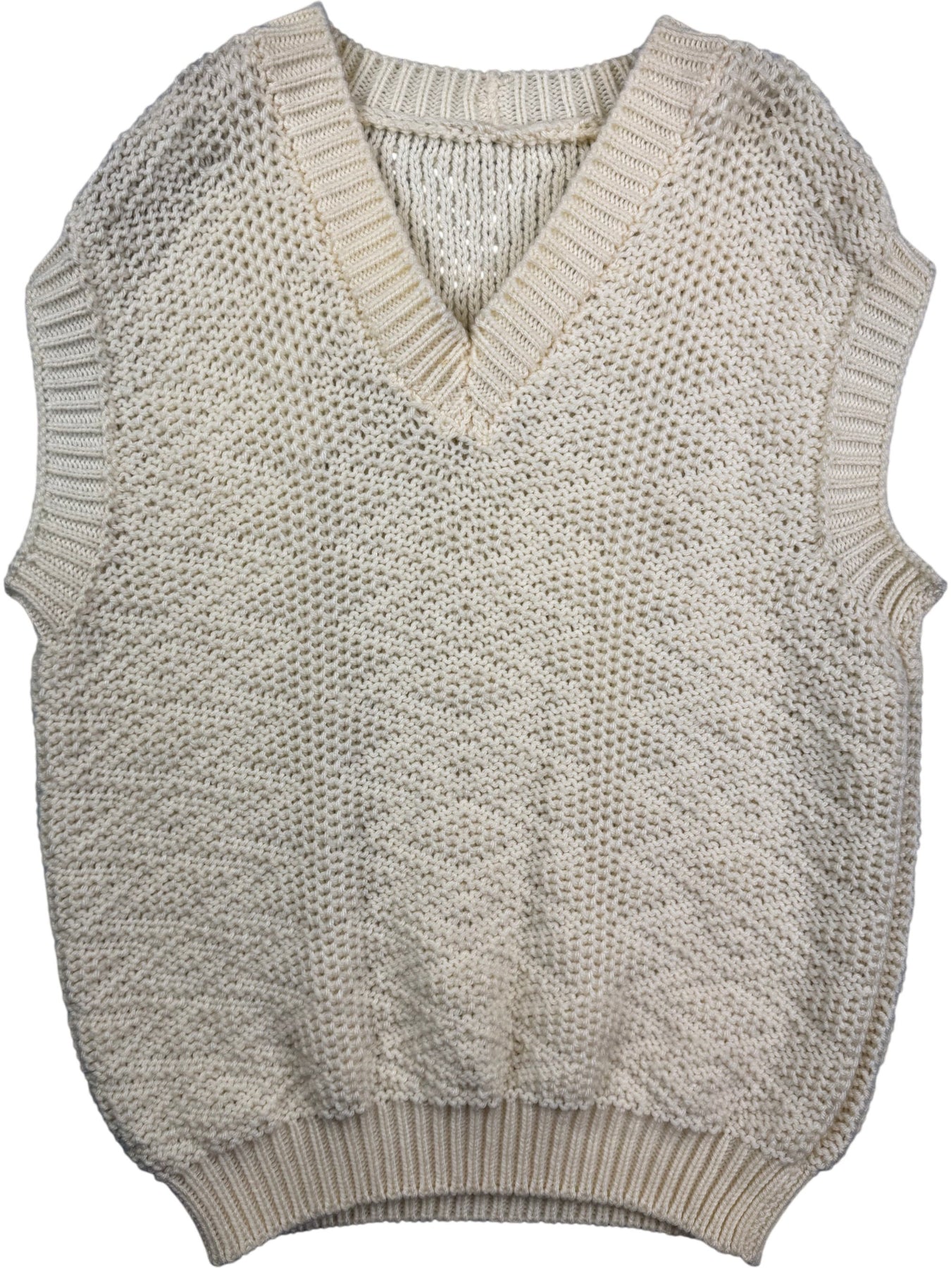 This cream sweater vest features a textured knit pattern with a classic V-neck design. It is sleeveless with ribbed trims at the neck, armholes, and hemline. Ideal for layering in cooler weather.