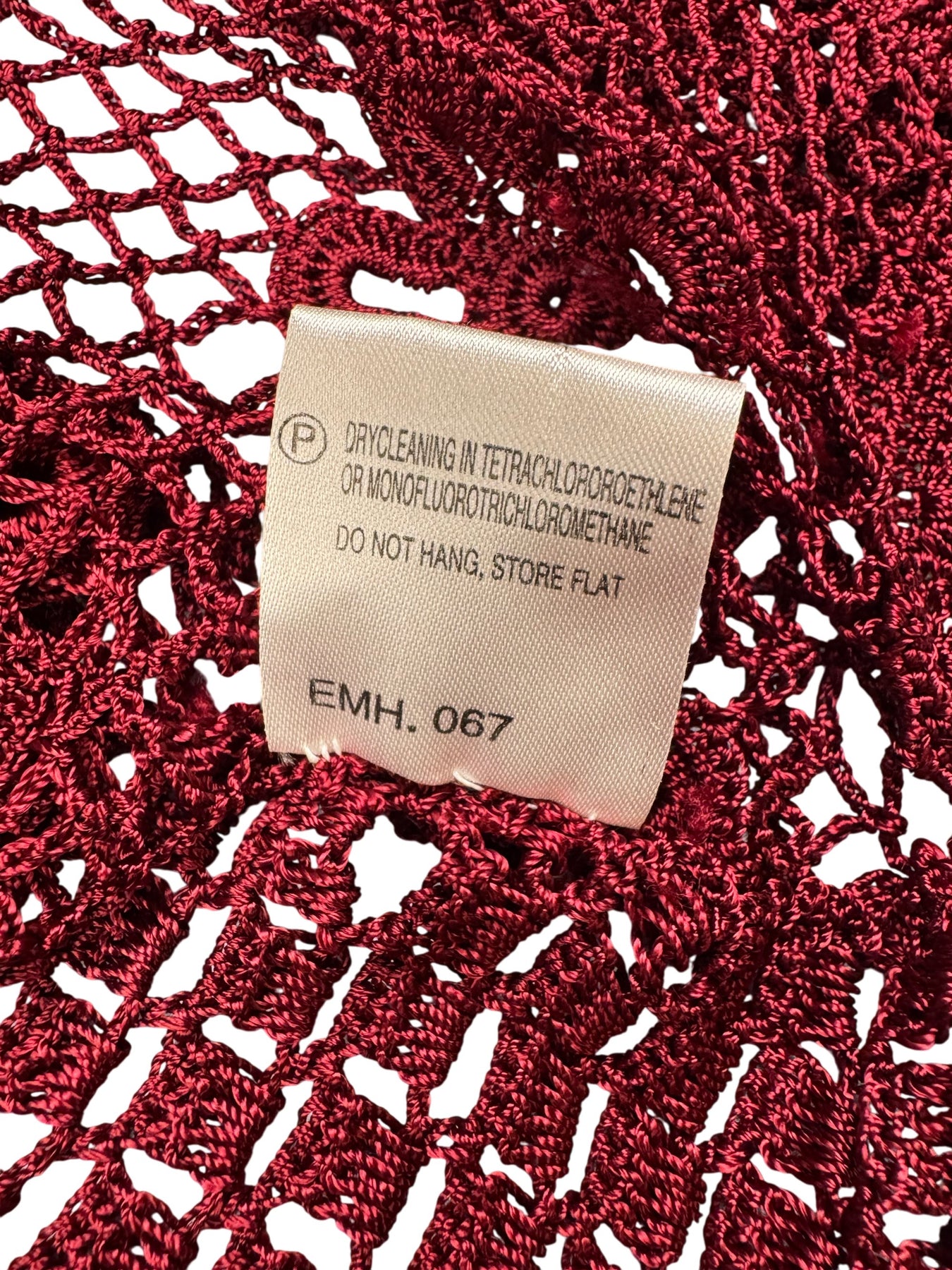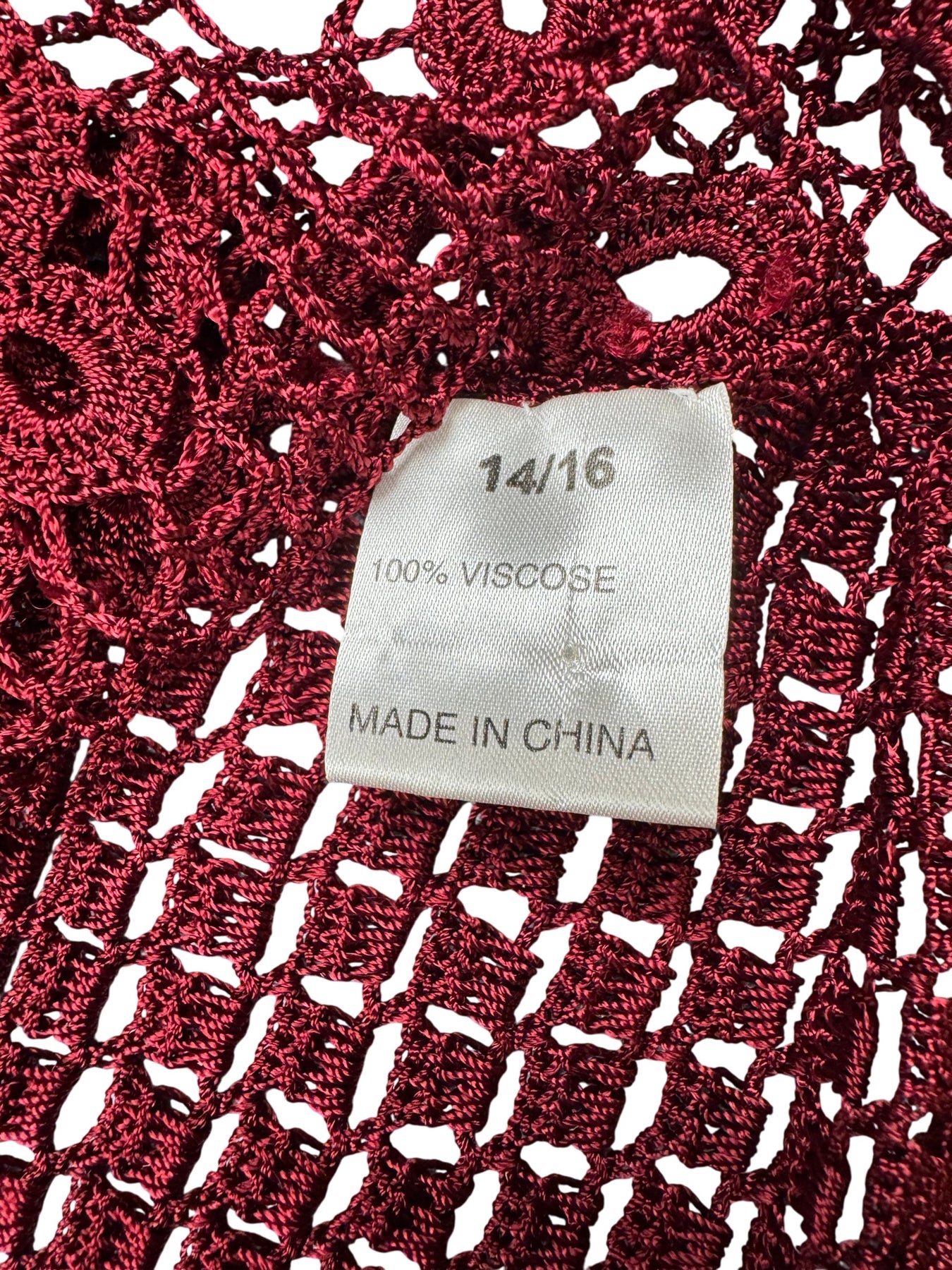 Elegant crochet cardigan with intricate floral patterns. Made from 100% viscose, providing a soft and delicate texture. Features a button-up front with a scalloped hem and cuffs.