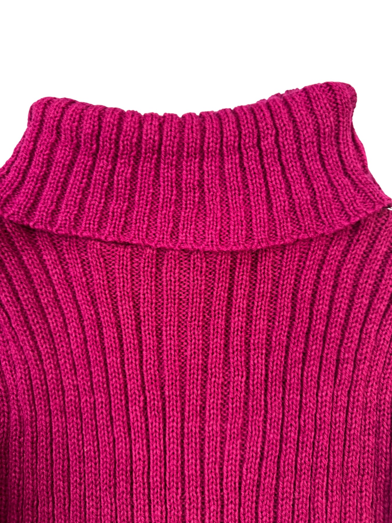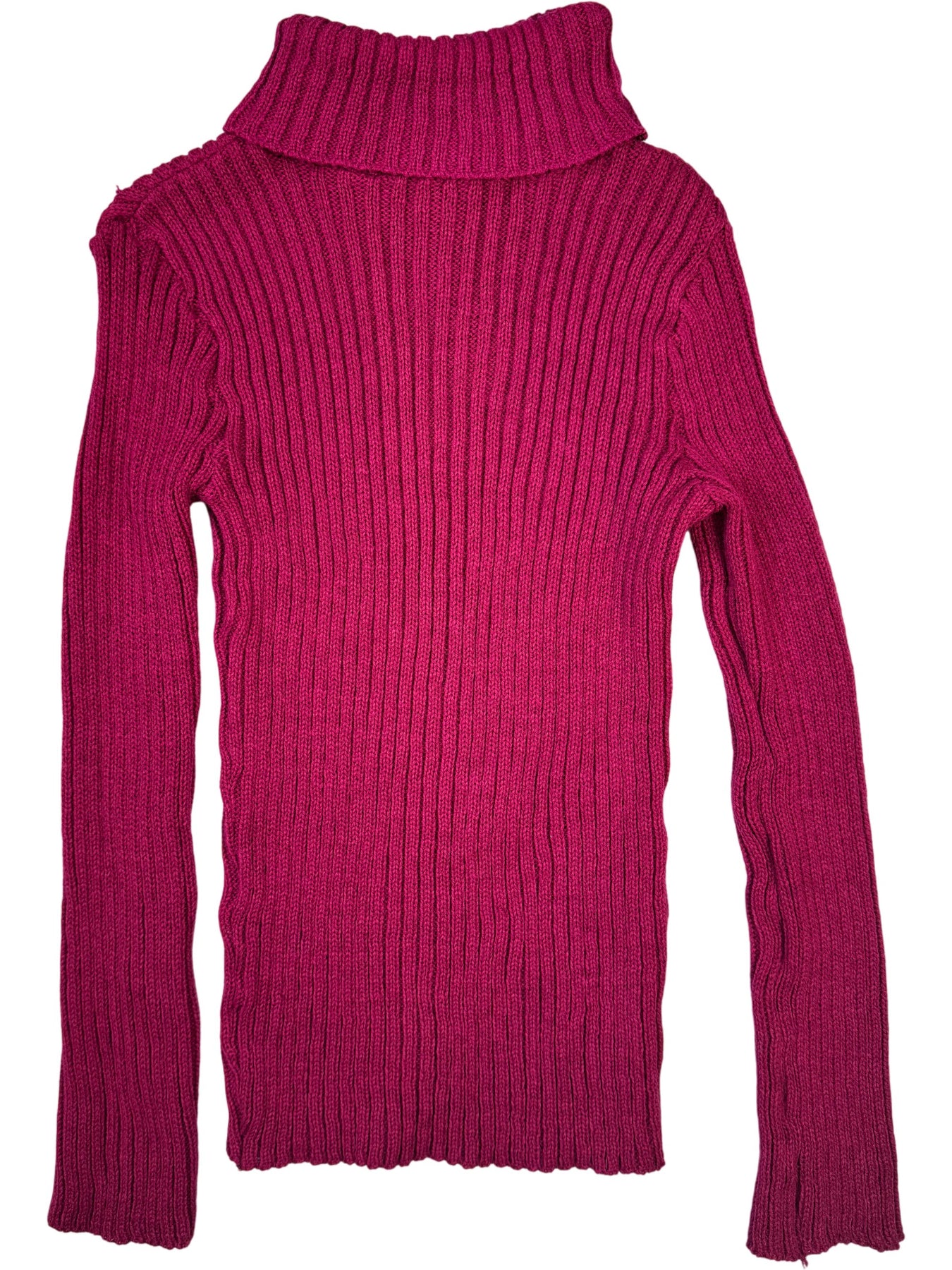 Pink ribbed knit sweater with turtleneck design. Features long sleeves and a fitted silhouette.