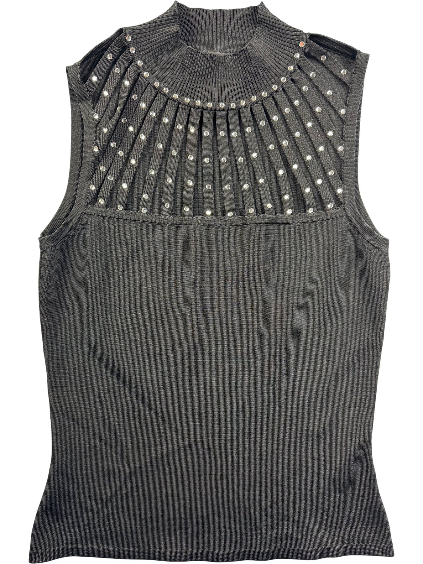 This sleeveless knit top features a ribbed, embellished neckline with metallic studs. Made from 80% rayon and 20% nylon, it offers a sleek and comfortable fit. The fabric is lightweight, making it ideal for layering or wearing alone.
