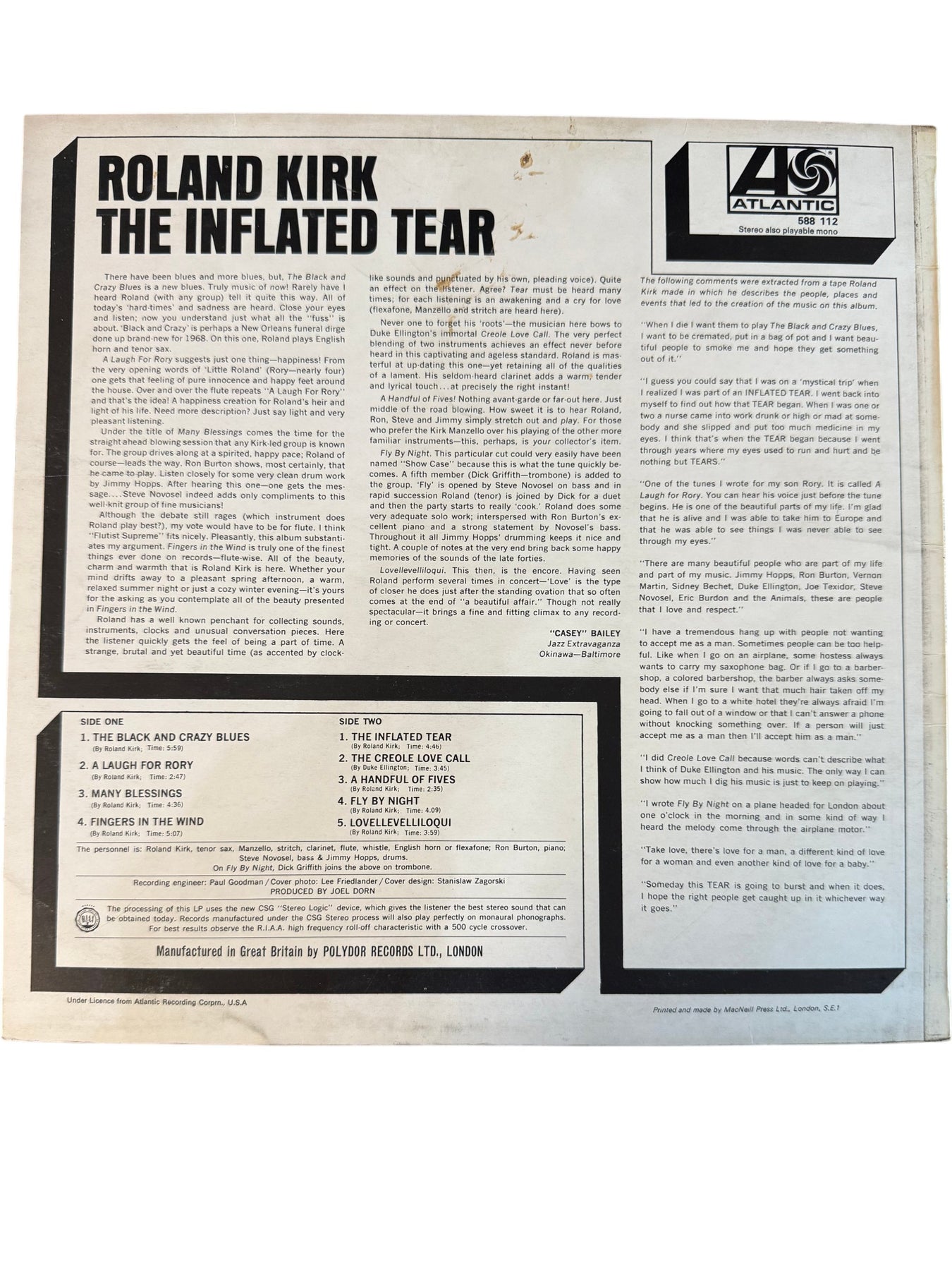 Vinyl record featuring Roland Kirk's album 'The Inflated Tear' released in 1968. Includes tracks like 'The Black And Crazy Blues' and 'The Creole Love Call.' Manufactured in Great Britain by Polydor Records Ltd.