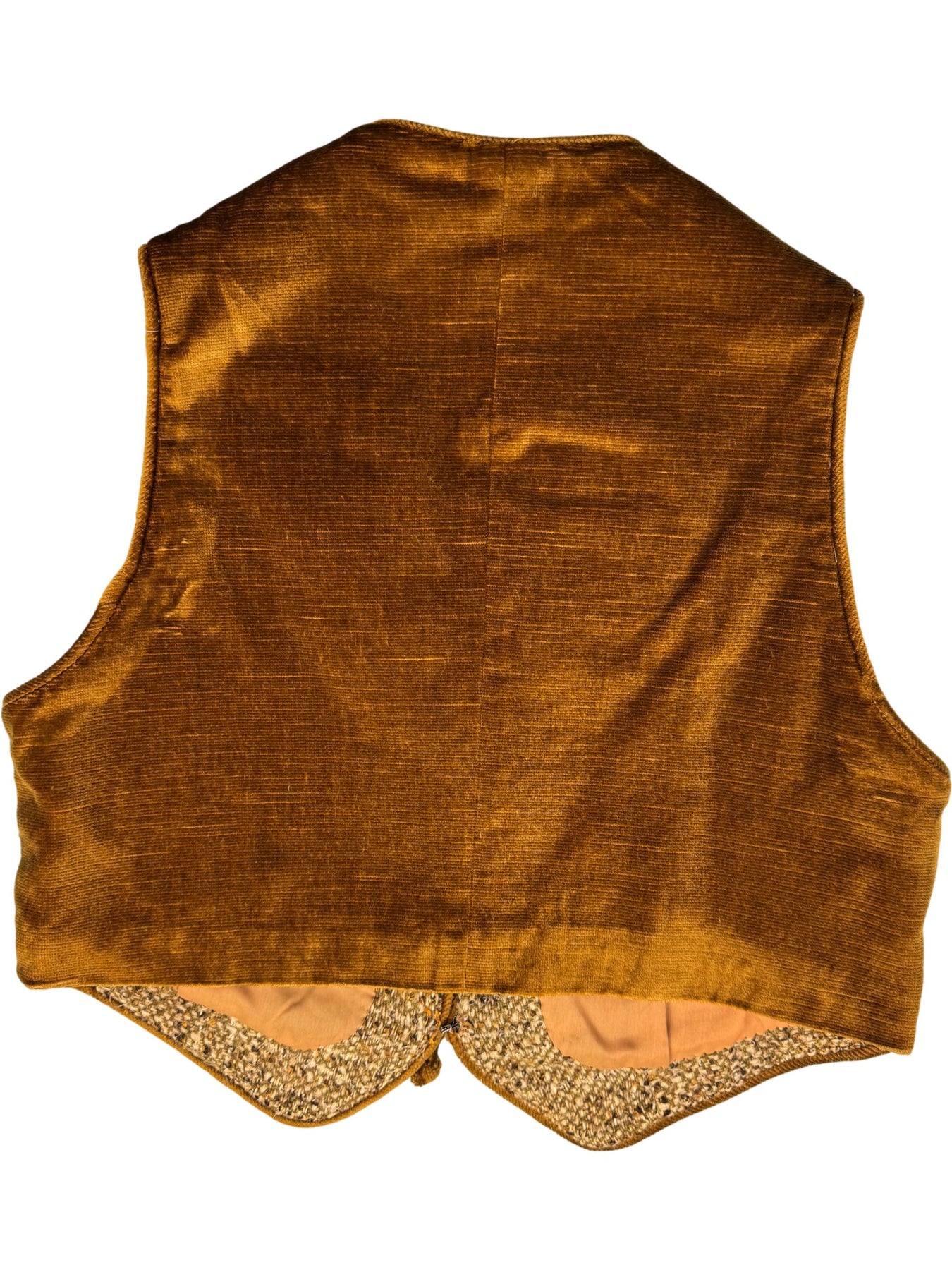 This 1970s vest and skirt set features a textured knit fabric in a warm, multicolored pattern. The vest has a simple tie closure and is fully lined. The skirt is designed to complement the vest and is also fully lined for comfort.