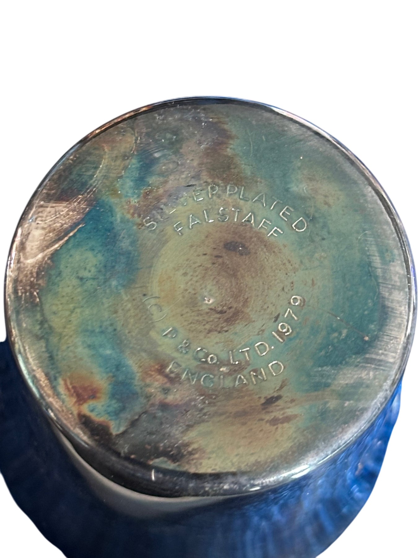Silverplated bell featuring a decorative figure on the handle. Engraved with a detailed design on the bell. Made by Cavalier in England.