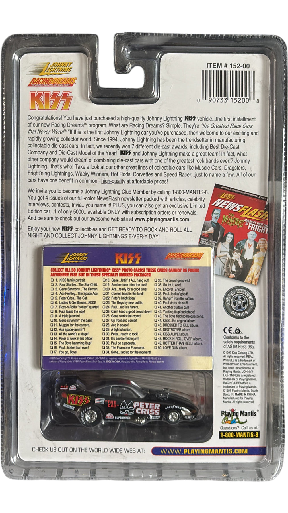 Johnny Lightning die-cast car featuring KISS theme. Includes rubber 'real wheels' and detailed body and chassis. Comes with a bonus photo card.