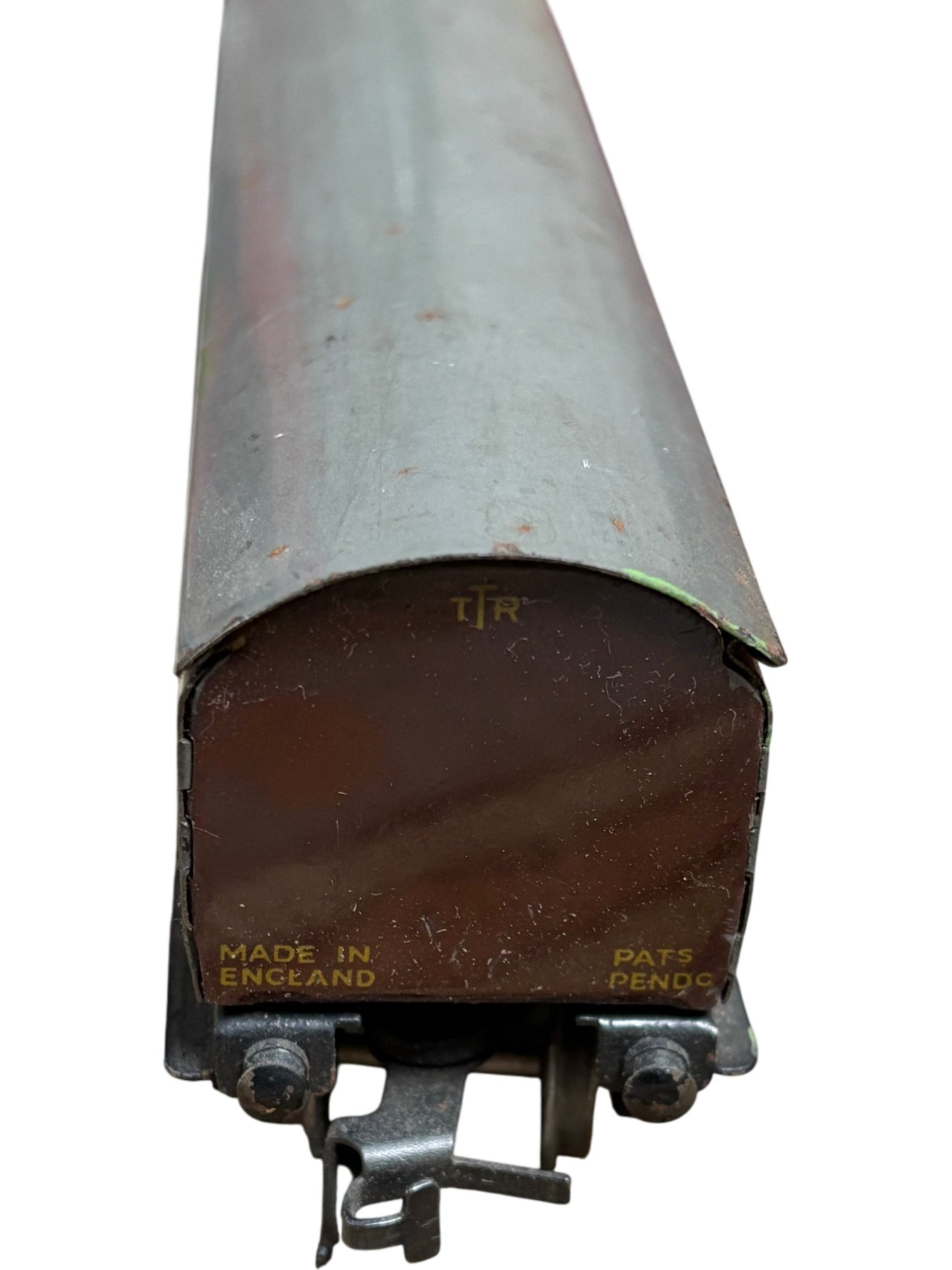 Vintage model train carriage featuring LMS logo, marked with 'Made in England'. Bogie coach brake design, model number 2/570. Original packaging included.