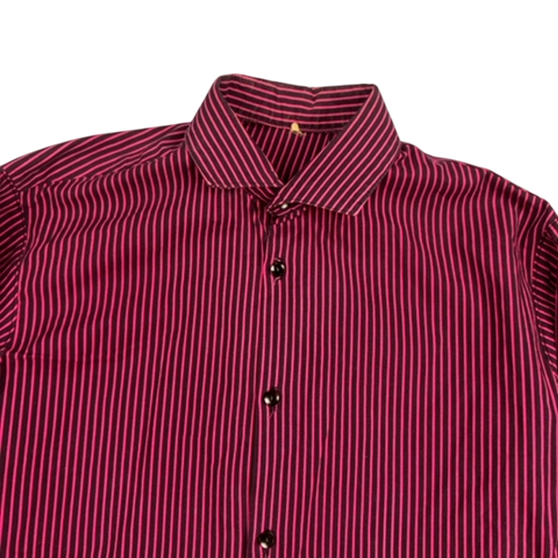 Red and black striped pattern long sleeved shirt with a classic collar and button-up front. Made from a breathable fabric for comfort.