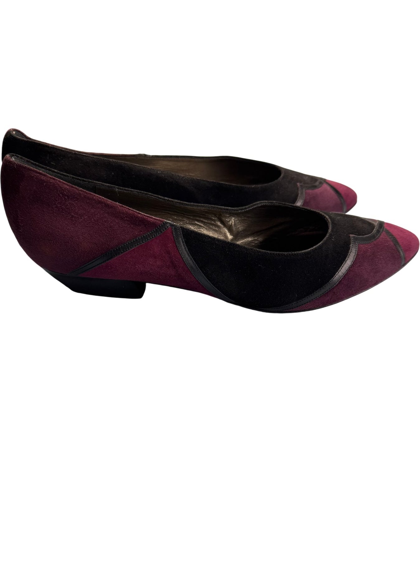 Suede two-tone flats with pointed toe design. Features a combination of black and burgundy suede with contrasting leather trim. Made in Italy.