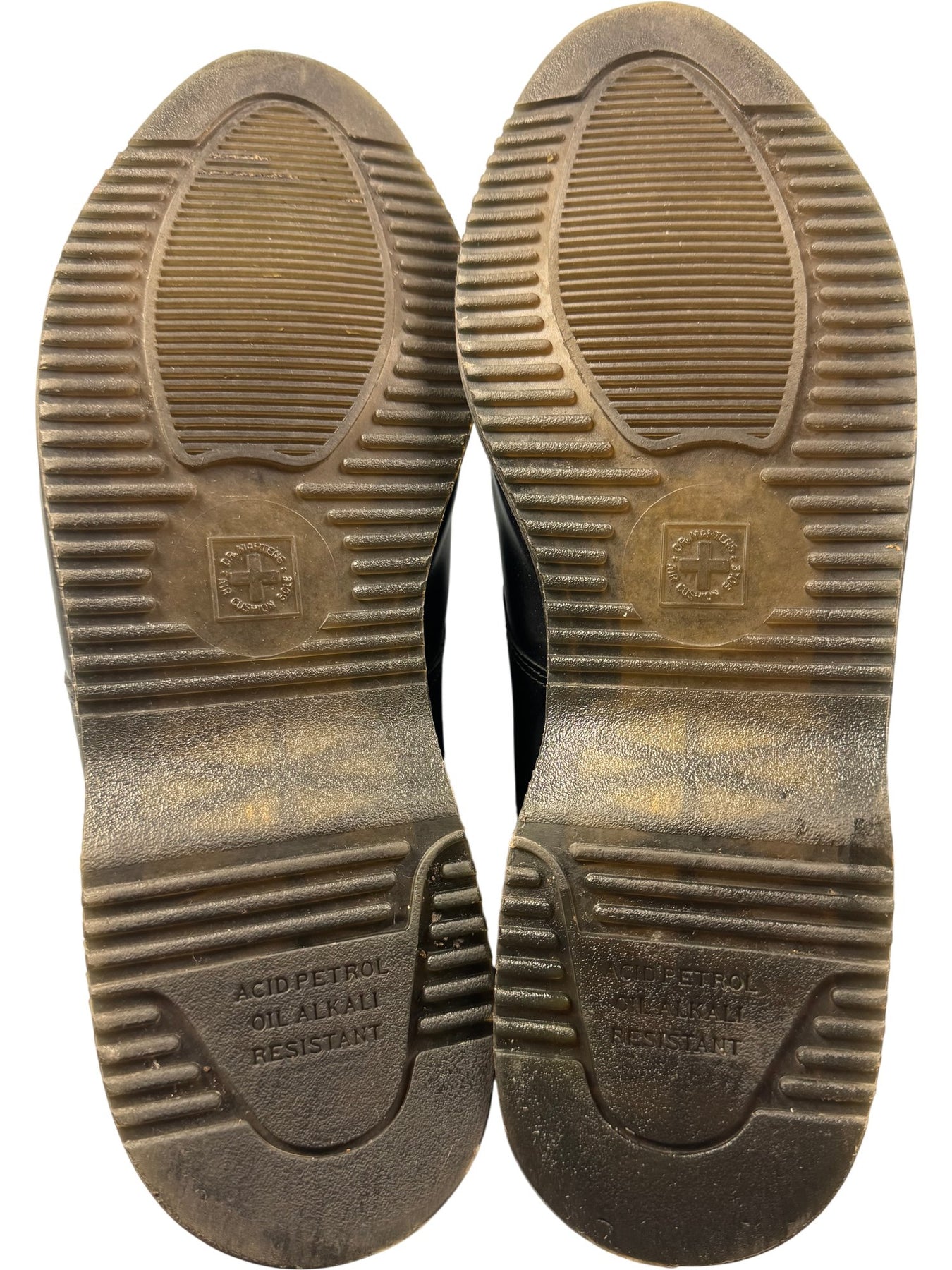 Black leather shoes featuring a studded design with lace-up closure. Durable rubber soles that are acid, petrol, oil, and alkali resistant. Distinctive Dr Martens branding on insole.