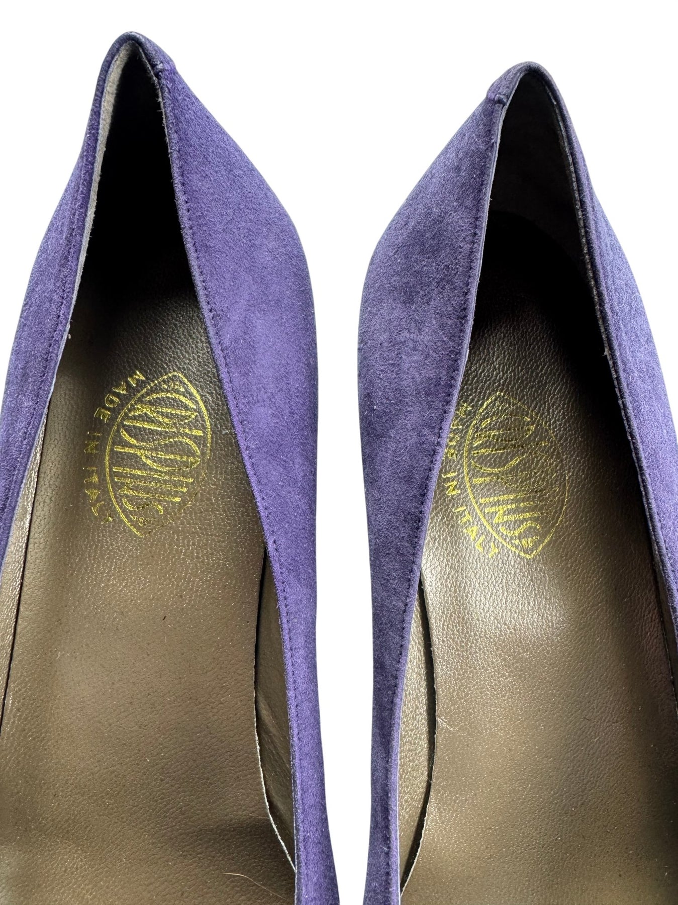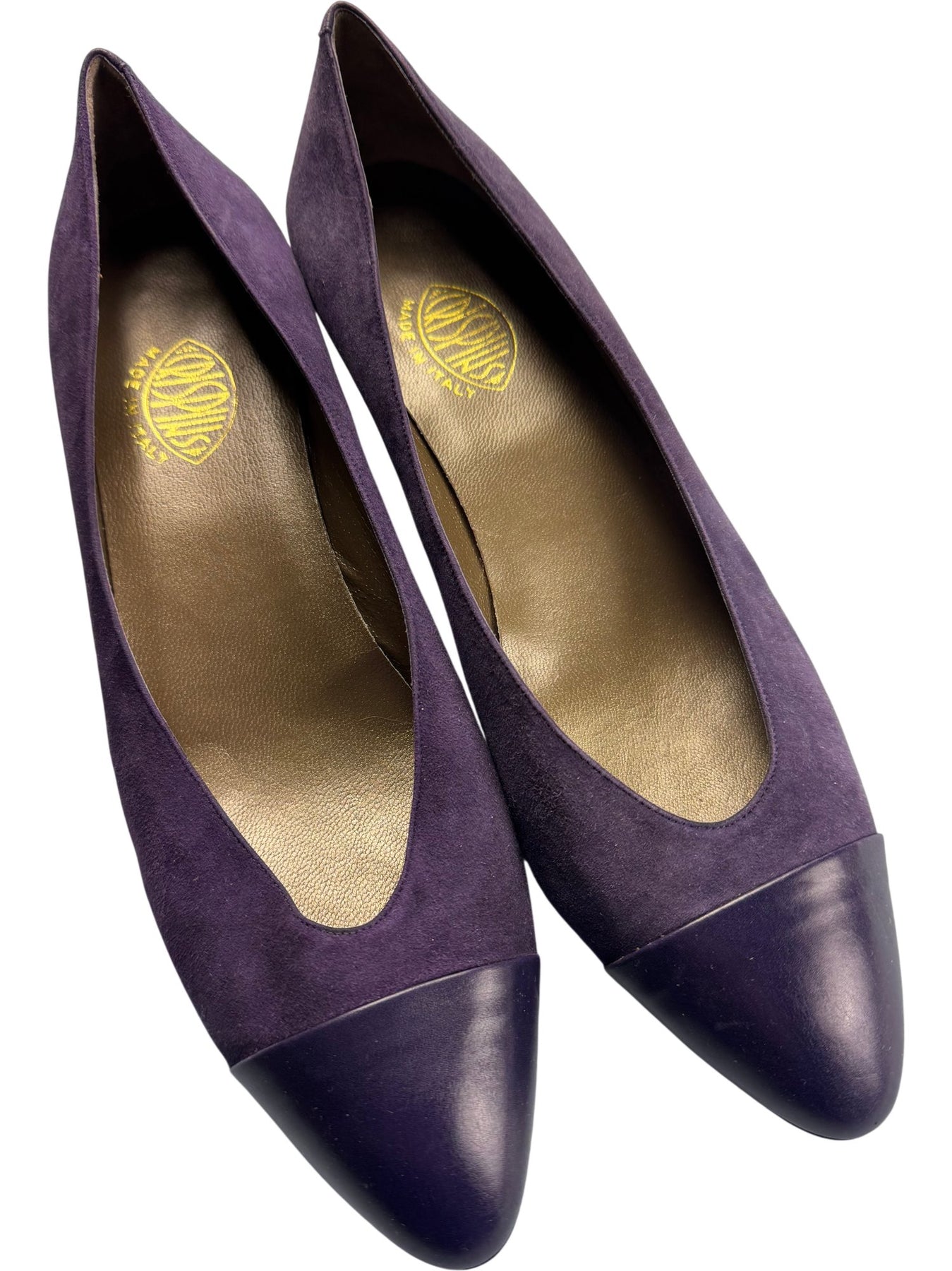 These Italian flats feature a purple suede upper with a black leather cap toe and a low heel. The insole is stamped with branding, indicating genuine leather materials. Made in Italy.