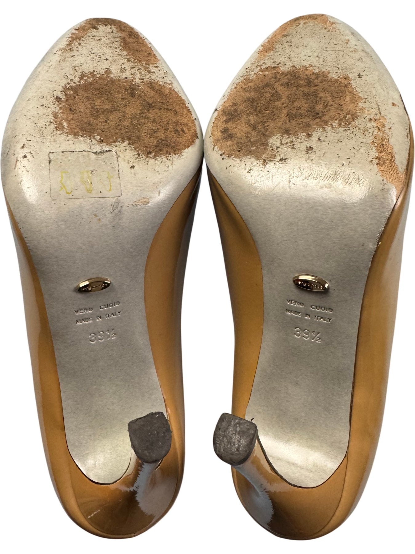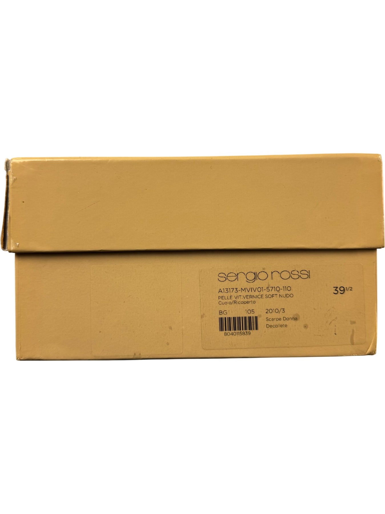 Sergio Rossi patent leather heels in a soft nude color. Crafted from high-quality leather and made in Italy. Features a classic pointed toe design and a stiletto heel.