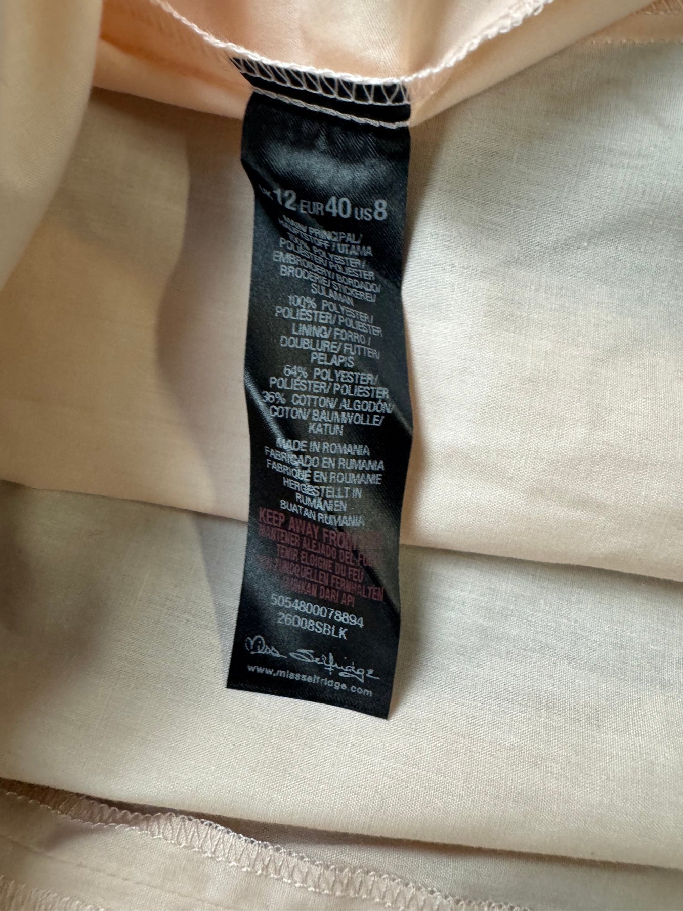 Strapless dress with floral embroidery. Made from 100% polyester, lining is 64% polyester and 36% cotton. Features a zip closure at the back.