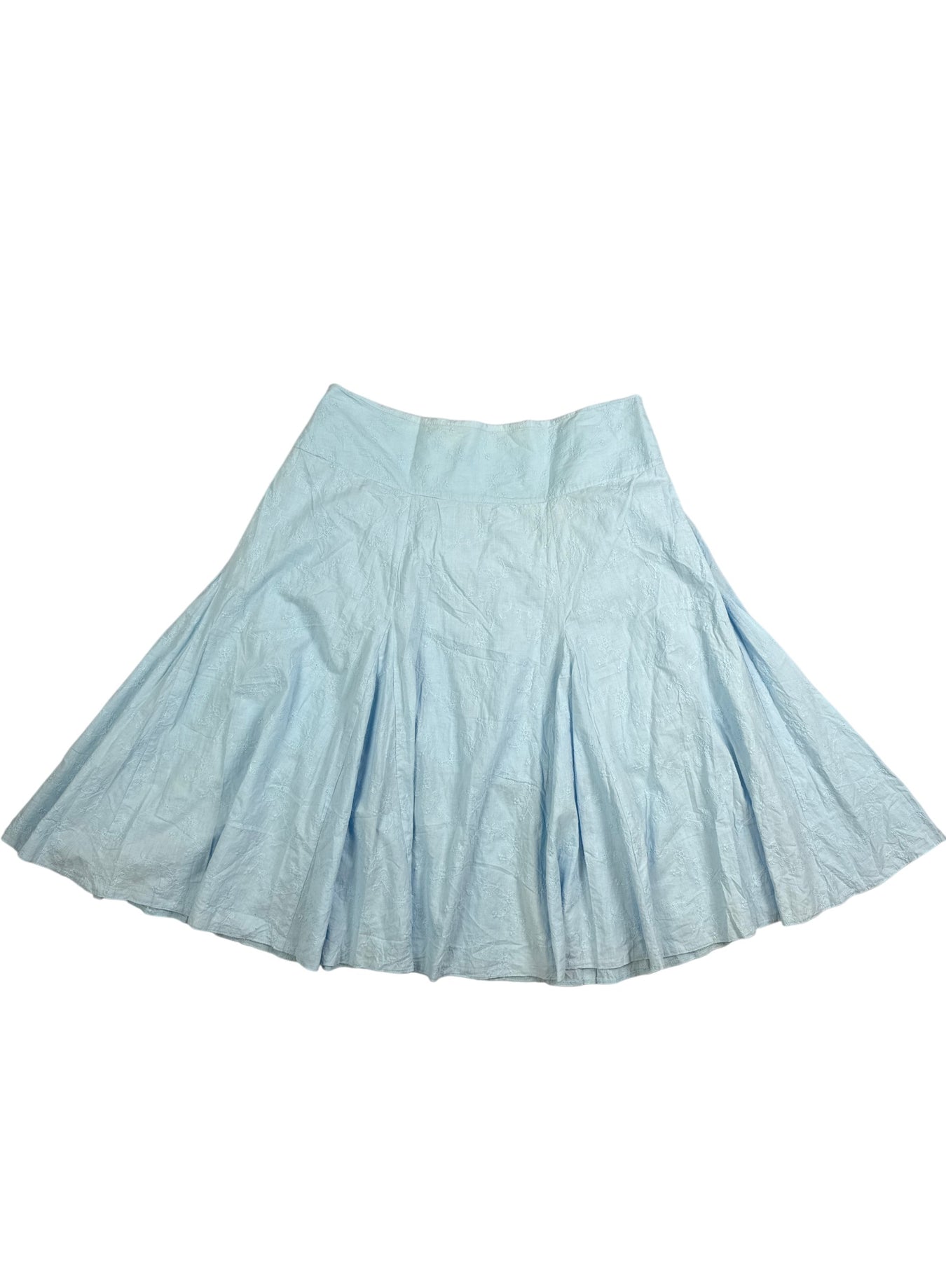 Light blue skirt with floral embroidery. Features a circle design giving a flowing silhouette and side zipper closure for easy wear.