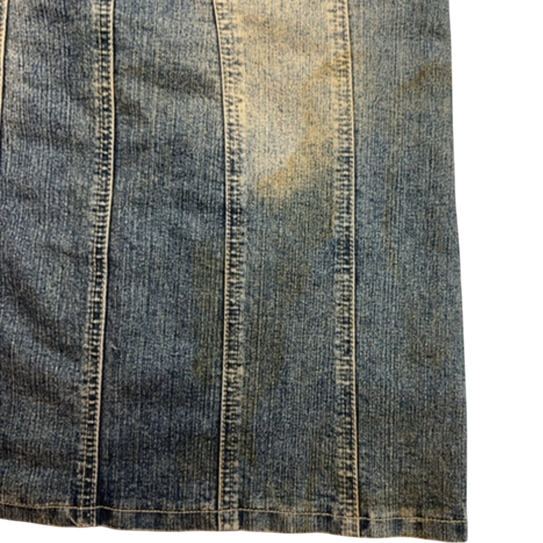 Denim skirt with a faded wash and front stitching detail. Includes side and back pockets, belt loops, and a button closure. Made of 96% cotton and 4% spandex.