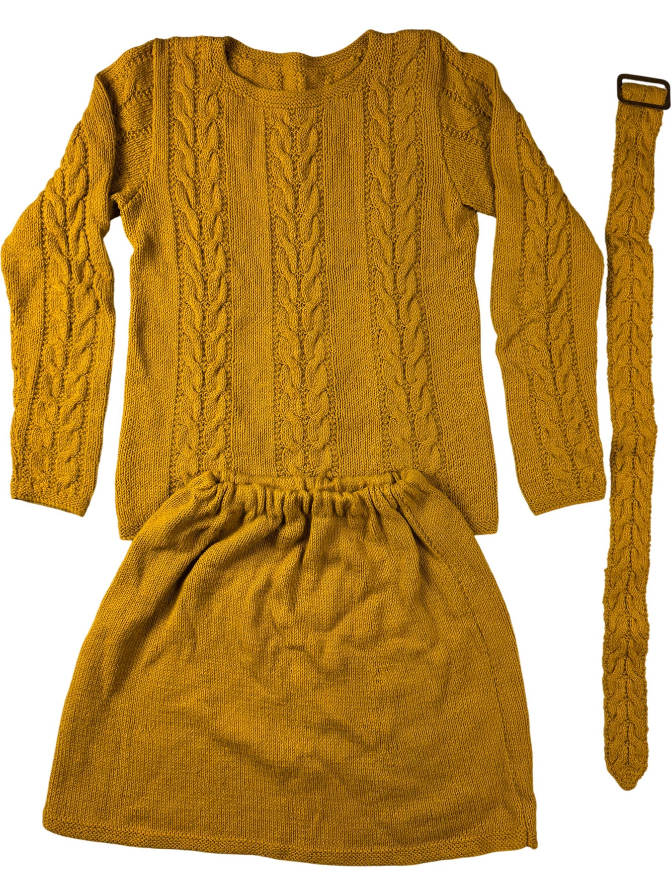 Cable knit dress set with a matching belt. Mustard colour with long sleeves and a round neckline. Includes a skirt and a belt with a matching pattern.