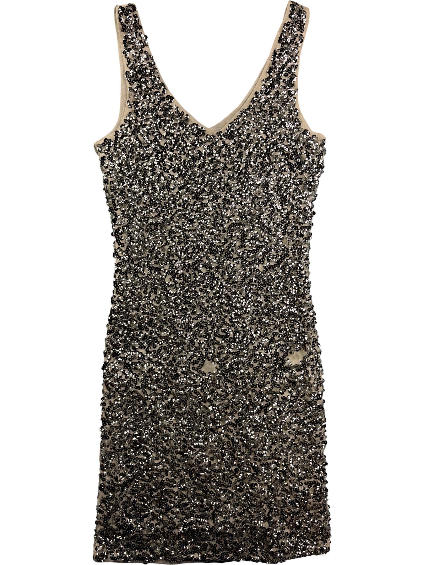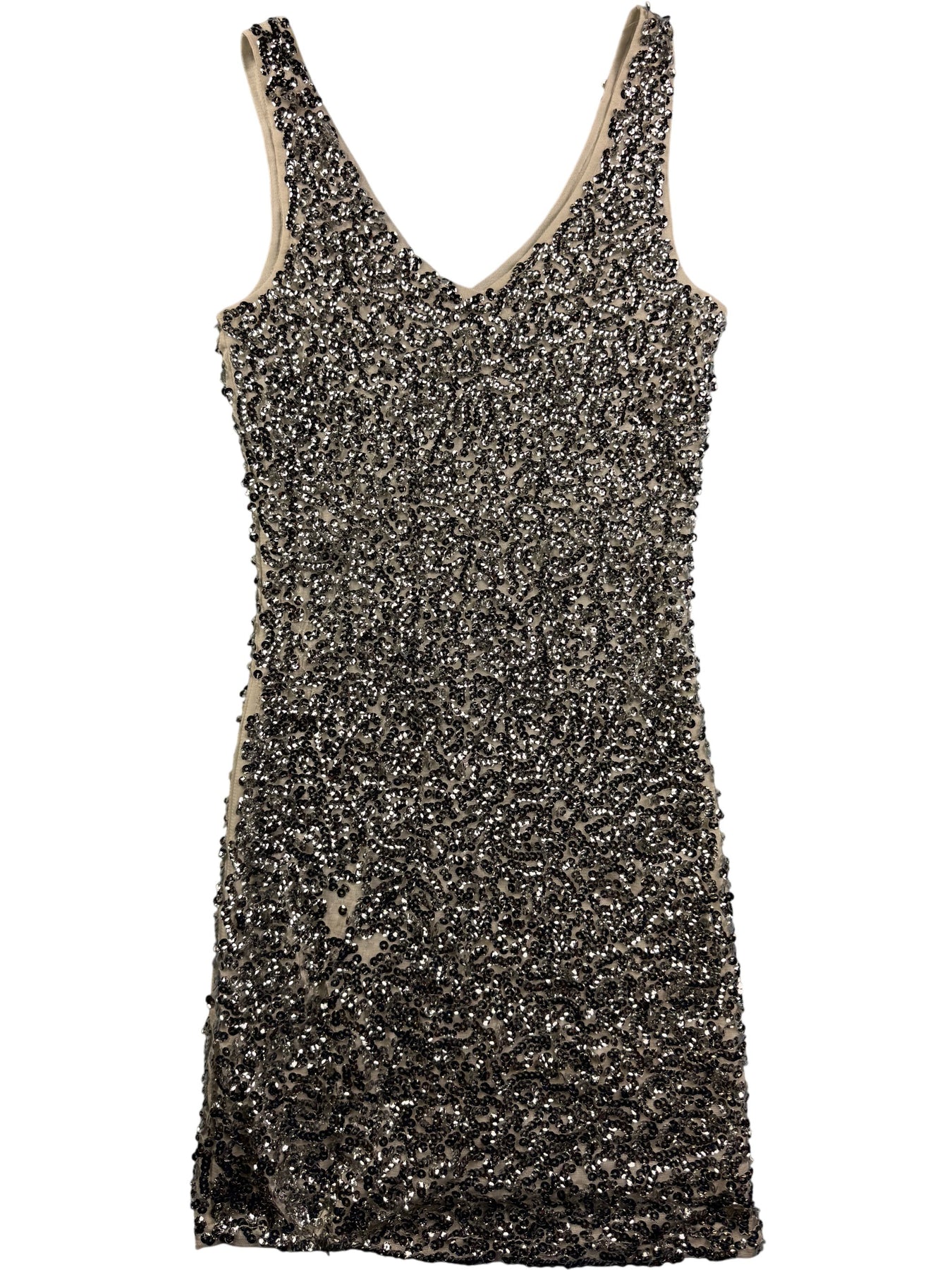 This polyester dress features an all-over sequin embellishment and a sleeveless design. It has a V-neckline and is designed for standout occasions.