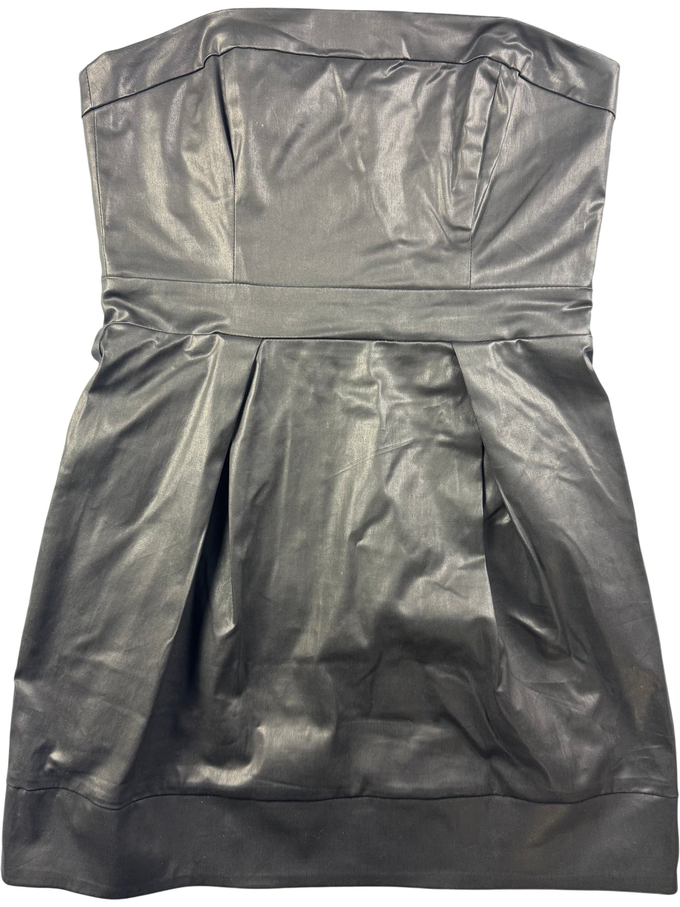 Black strapless dress with pleated front design. Made of 90% cotton, 3% elastane, and 7% polyurethane. Features a back zipper closure.