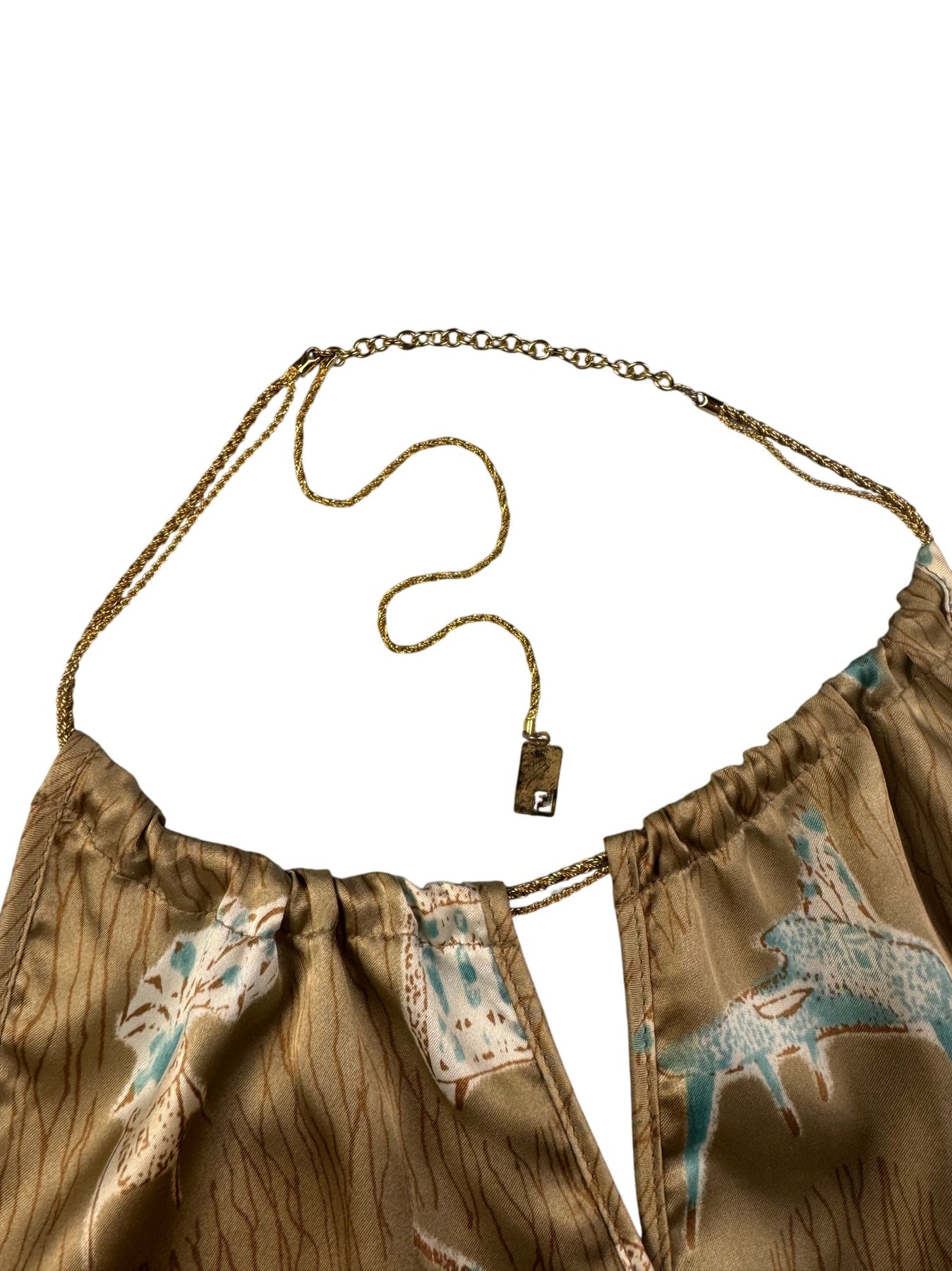 This Fendi halterneck top features a unique printed design with a chain strap and made from high-quality fabric. It has a stylish halter neckline and an open back for a chic look.