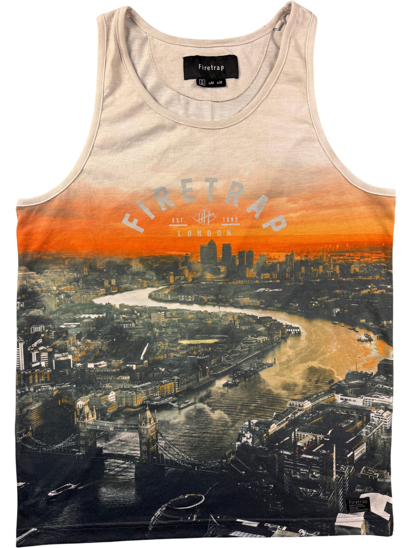 Sleeveless tank top with a vibrant cityscape print featuring Firetrap branding. Made from 100% polyester for a comfortable fit.