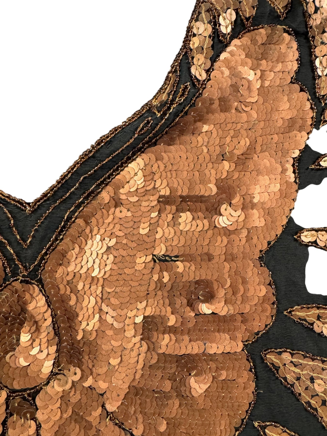 Black silk top adorned with gold sequins in a butterfly design. Features wide, winged sleeves and intricate beadwork. Made in India and labeled as one size.