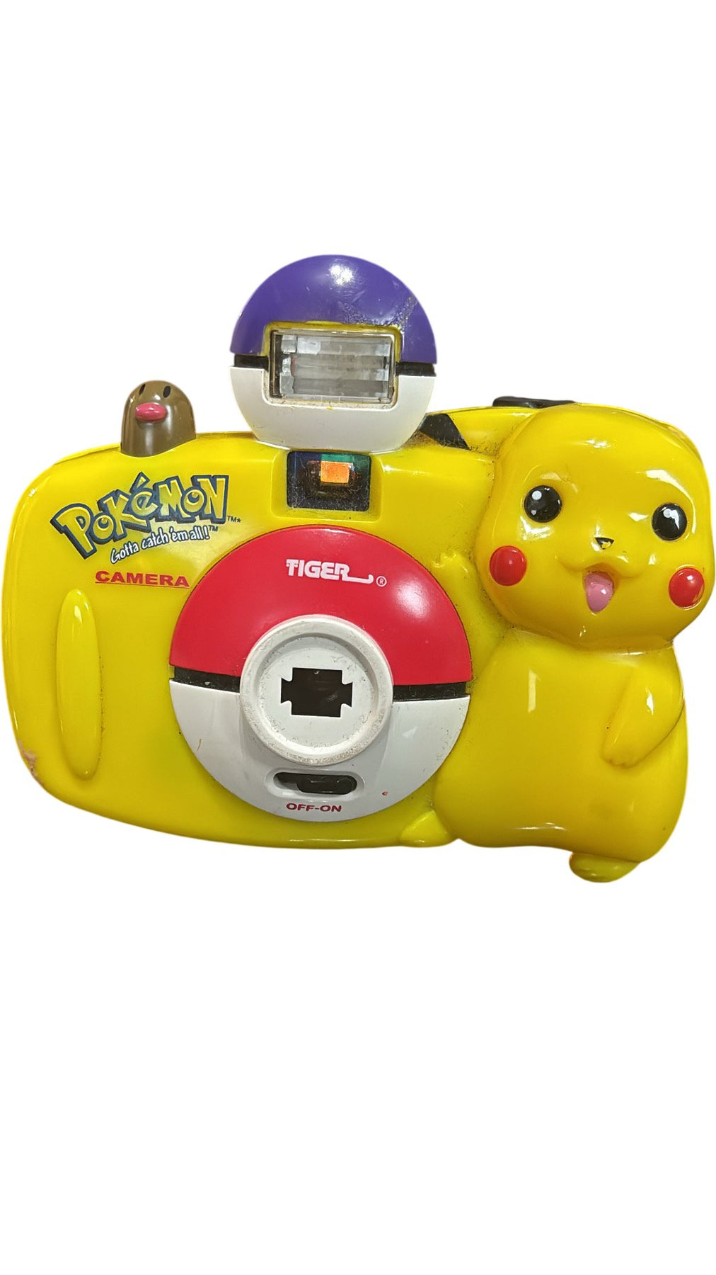 Pokemon-themed camera featuring Pikachu design. Includes built-in flash and uses film. Manufactured by Tiger Electronics.