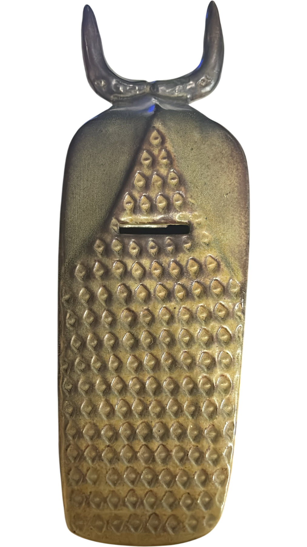 Unique ceramic bull figurine designed as a coin bank. Features a textured pattern on its back and a slot for coins. Crafted with attention to detail, ideal for home decor or as a gift.