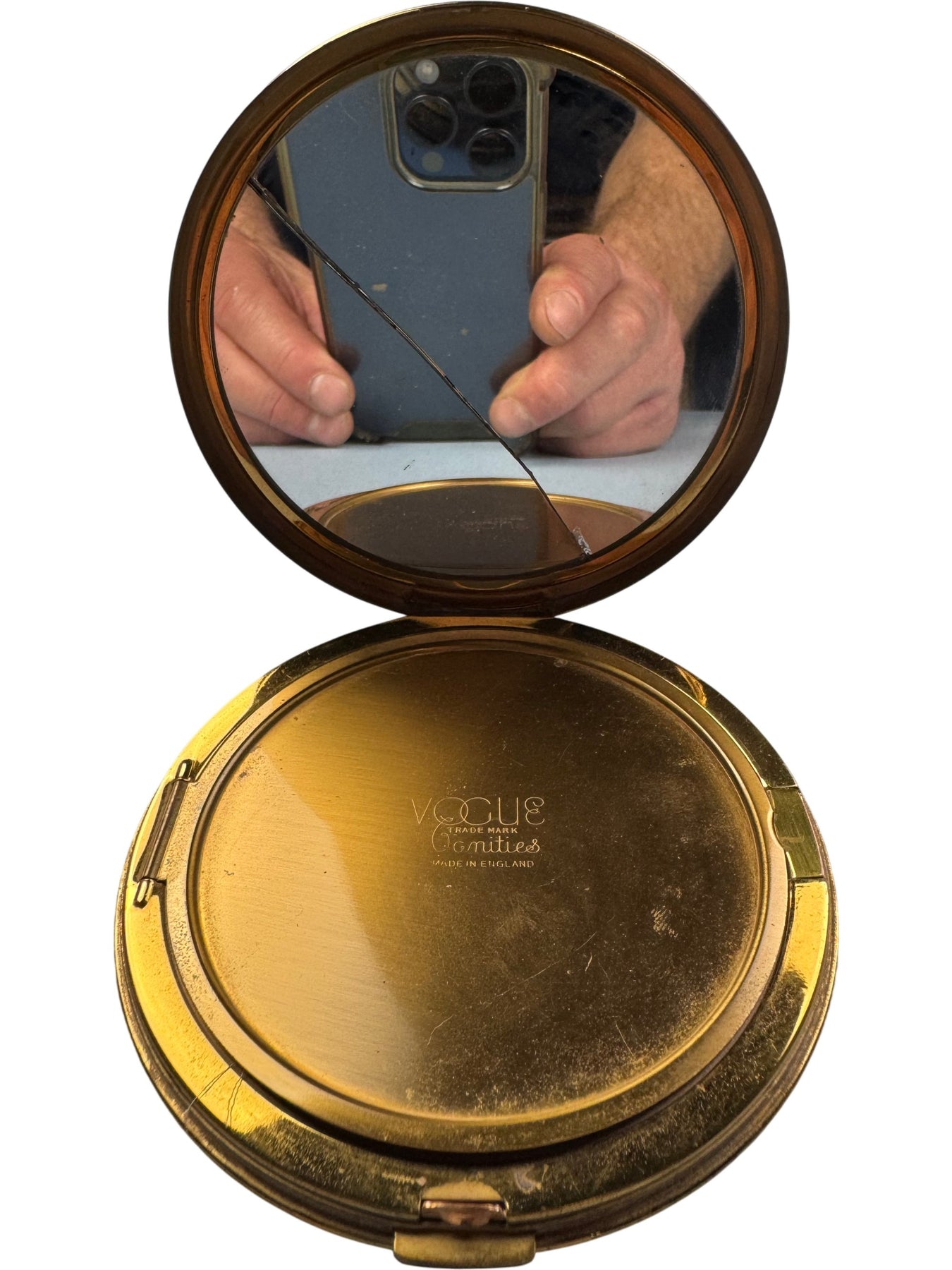 Vintage compact mirror designed in the Art Deco style. Features an intricate design on the exterior and includes a mirror inside. Made by Vogue Compacts in England.