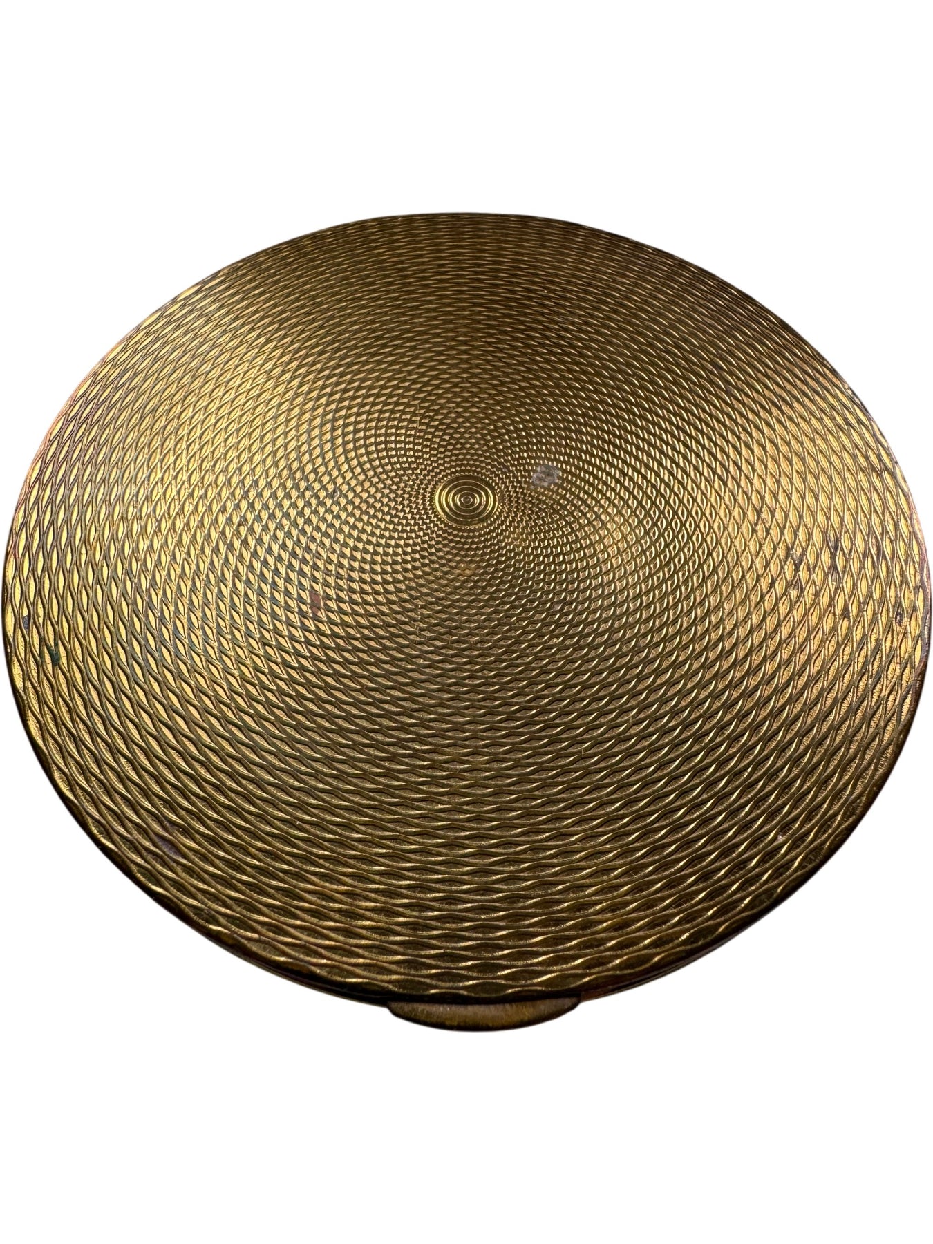 Compact features a gold metal body with intricate enamel floral design. Includes a mirror and a powder compartment. Made in Great Britain by Mascot.